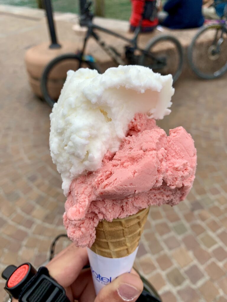 Zurück in Riva del Garda, gönne ich mir im Zentrum direkt ein Eis. Das habe ich mir heute redlich verdient. Was meint ihr, kann das Erdbeereis das Eis von Gossensass vom Thron stoßen? Vorweg, das Limoneneis ist sehr lecker. Das Erdbeereis ist aber eher Standard. In Ordnung aber nicht überragend.