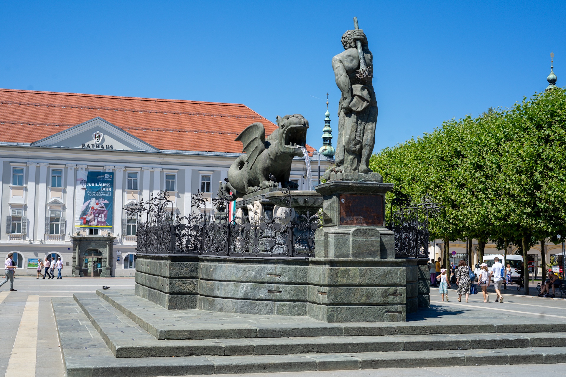 In Klagenfurt selber lassen wir die „Innere Stadt“ auf uns wirken. Direkt am Rathausplatz steht der große Lindwurm, der einer Sage nach in den Sümpfen um Klagenfurt erschlagen wurde und deshalb das Wappentier der Stadt ist.