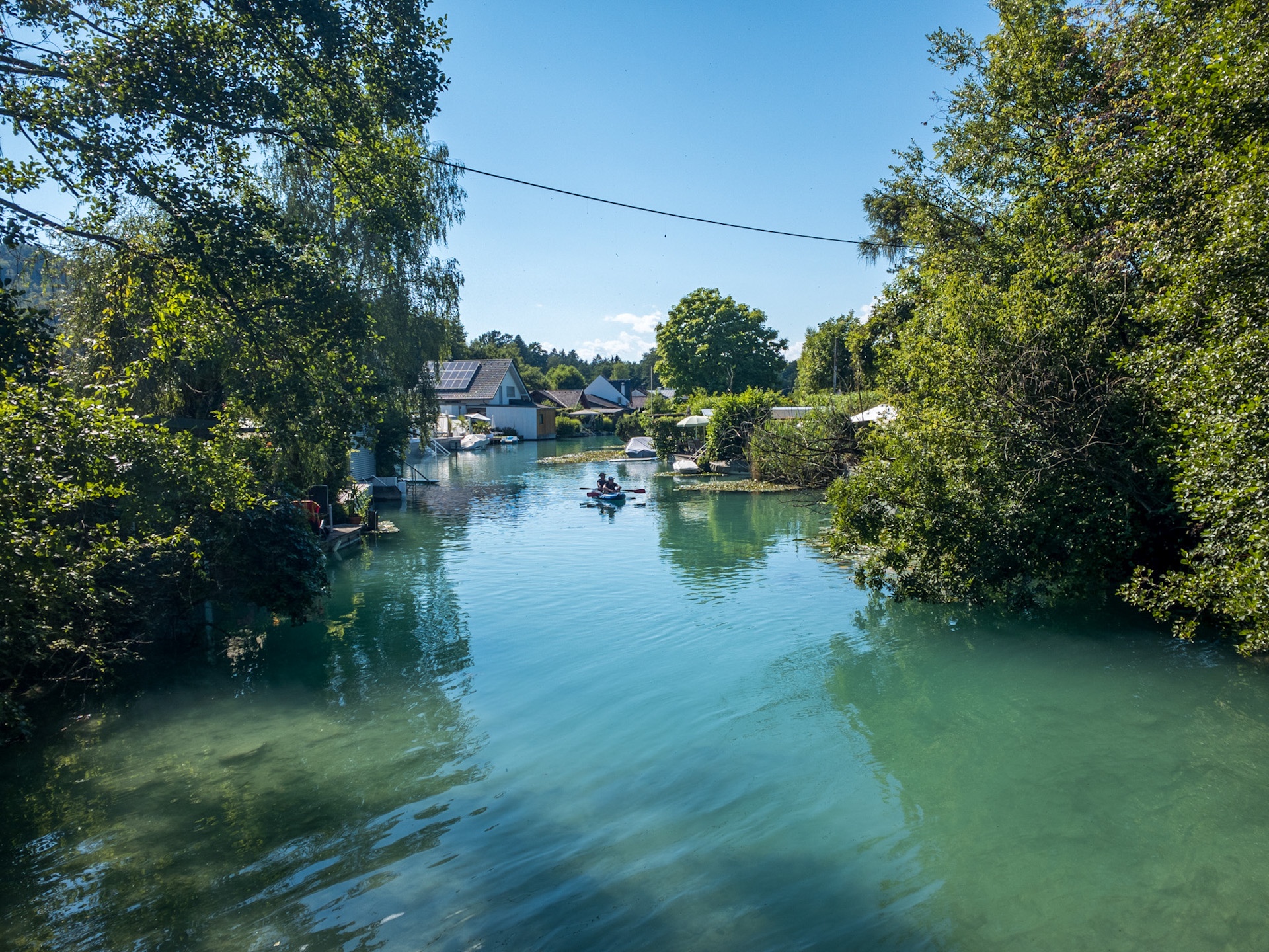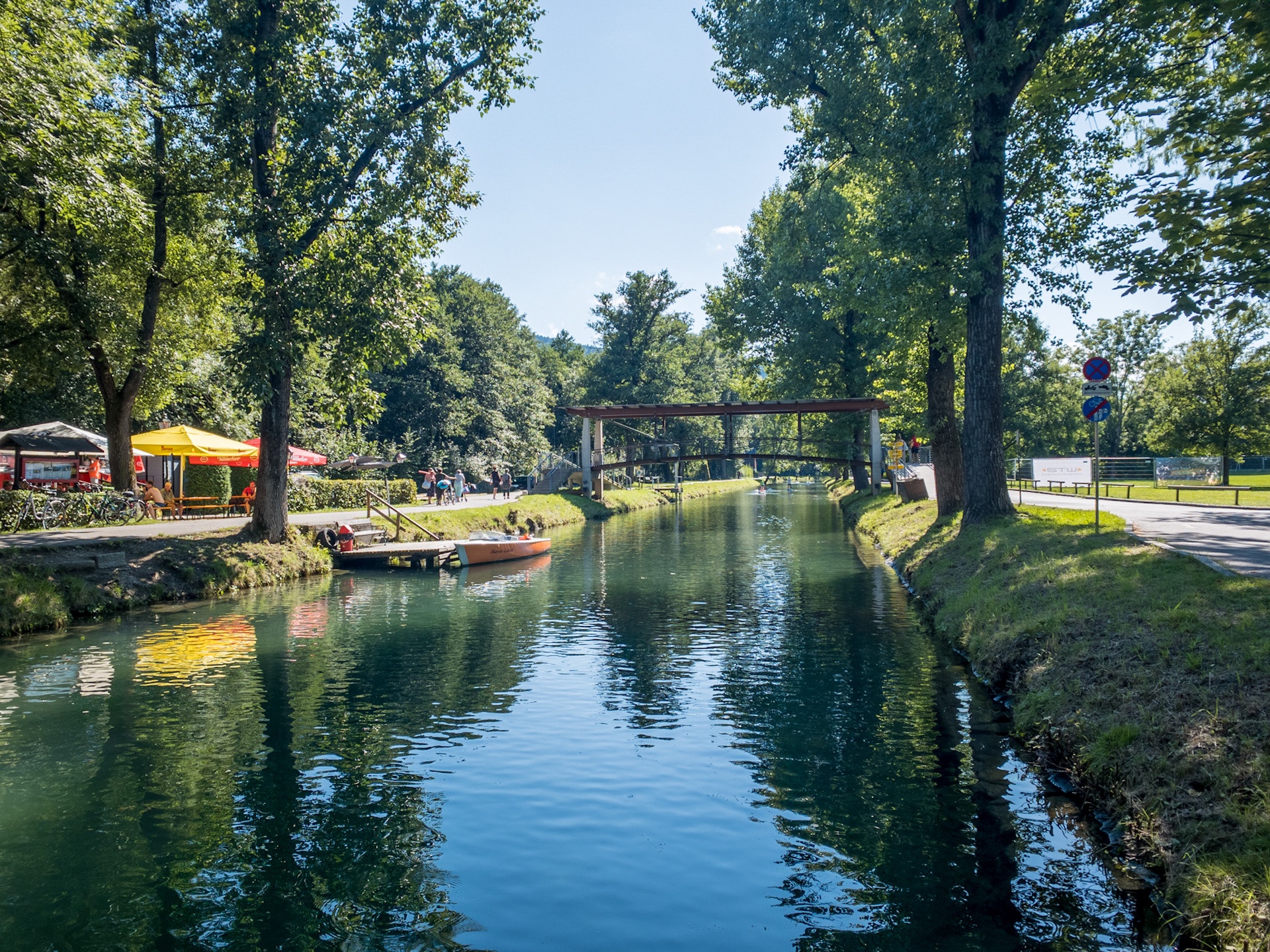 Die Rund 20 Kilometer und 100 Höhenmeter sind ohne Gepäck mittlerweile ein Klacks für uns. Wir genießen die schöne Landschaft und staunen immer wieder über die Prachtbauten rechts und links der Straße. In den Vororten Klagenfurts bekommen wir das erste mal das Gefühl, in Amsterdam gelandet zu sein. Mehrere Kanäle führen in die Stadt und auch die Häuser erinnern entfernt an bekanntes, nur das Wasser hat eine schönere, türkise Farbe.