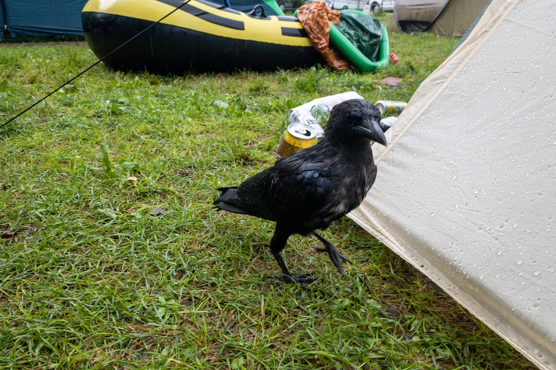 Wir telefonieren morgens mit dem Campingplatz Erlensee und siehe da, man hat einen Platz für uns. Kommt einfach vorbei heißt es. Also schnell abbauen, erst drinnen bei stärkerem Regen und dann die nassen Reste des Zeltes bei schwächerem Regen. Uns besucht ein Kolkrabe, der sich frech über die Reste des gestrigen Trinkgelages der Jungs her macht und die Zelte anpickt. Als er sich zu uns aufmacht versuchen wir ihn zu verscheuchen und werden frech angefaucht und in den Schuh gepickt. Ganz schön dreist.
