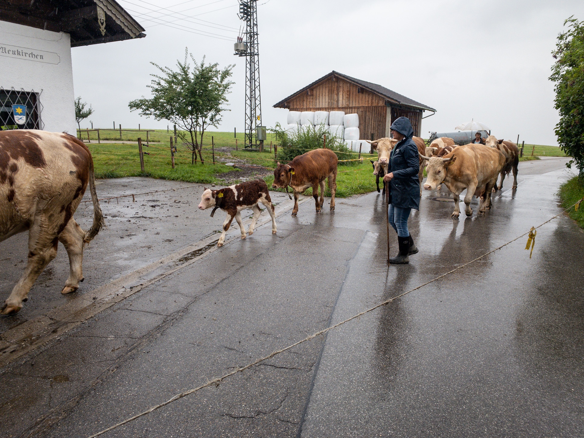 Zwischendurch werden wir aufgehalten. Die Straße ist wegen Viehtriebs gesperrt. Das Bayrische Fleckvieh (einige Leser legen wert auf die korrekte Bezeichnung von Großtieren) trottet langsam über die Straße und wir genehmigen uns einen Schluck aus unseren Wasserflaschen.