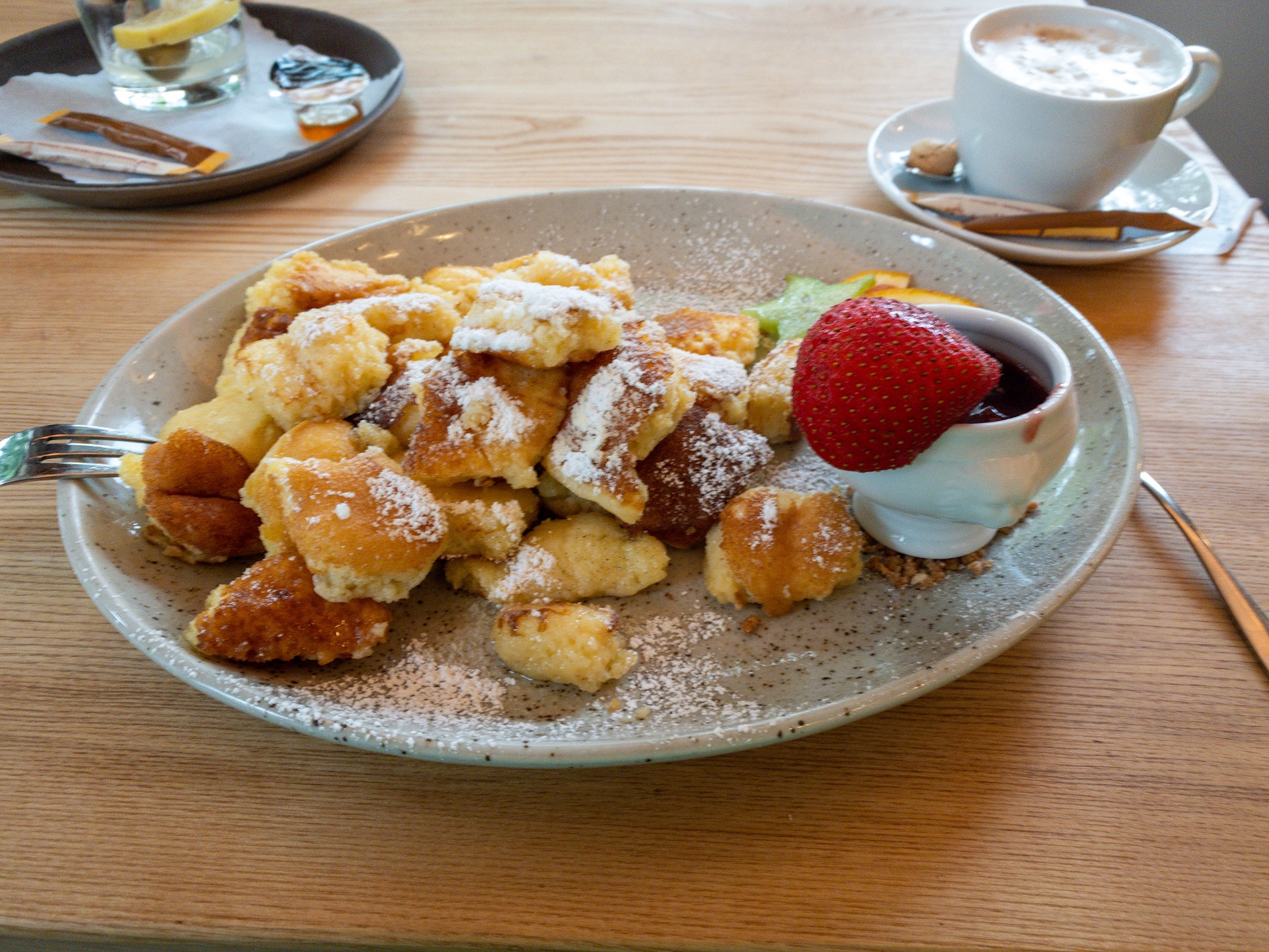 Hm, da kommen wir wahrscheinlich sogar dran vorbei. Mal gucken, ob wir dort halt machen. Den Kaiserschmarrn haben wir uns geteilt, aber nur weil Christian etwas zu viel Wurstsalat hatte und den Kaiserschmarrn übersehen hat.
