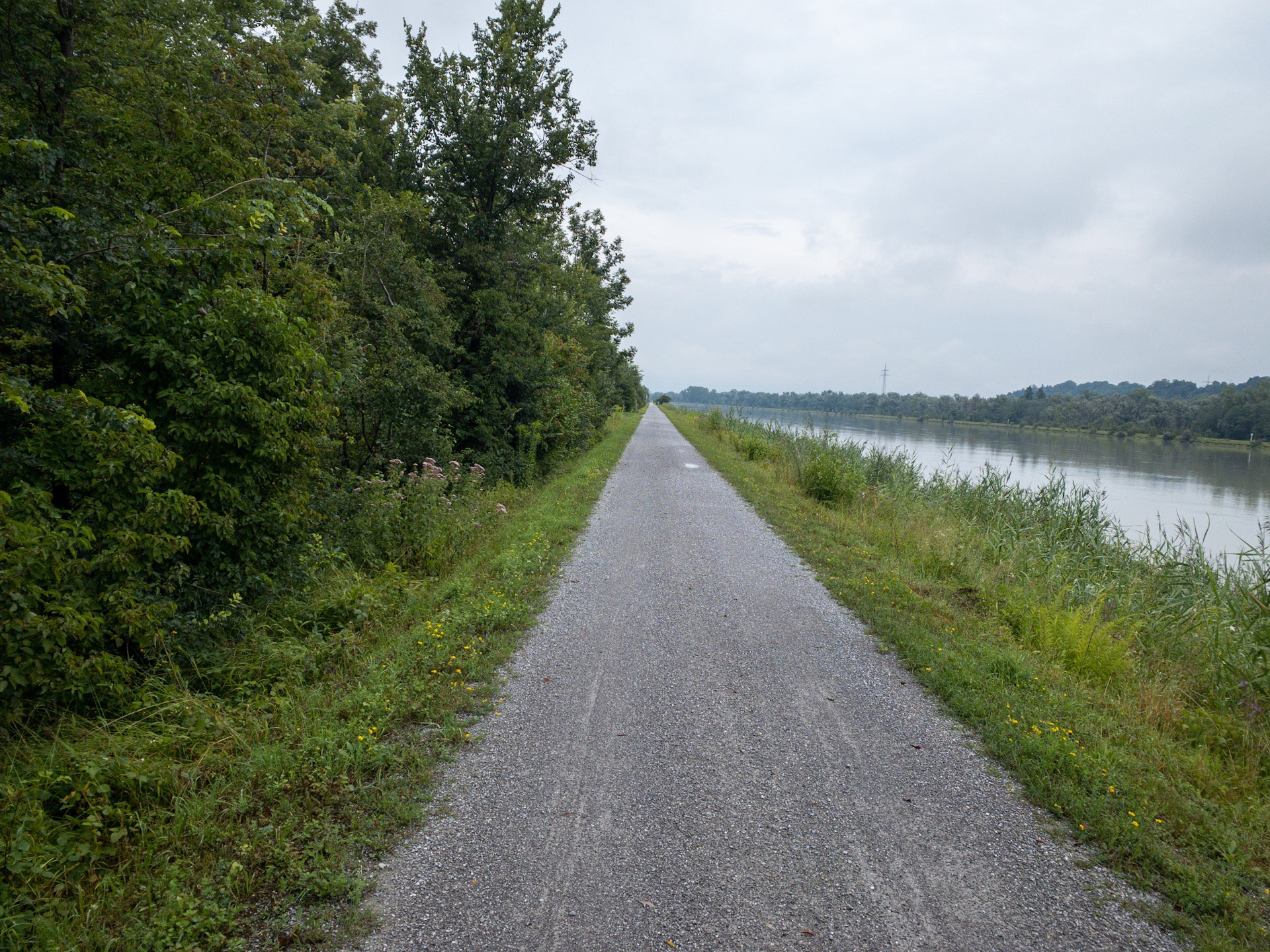 Wir nehmen unsere 9 Packtaschen und machen uns auf den Weg zum Campingplatz Erlensee. Bis zum Campingplatz verschont uns der Regen. Die Route führt über einen gut befestigten Schotterweg am Inn entlang. Es geht also doch, auch in Bayern.