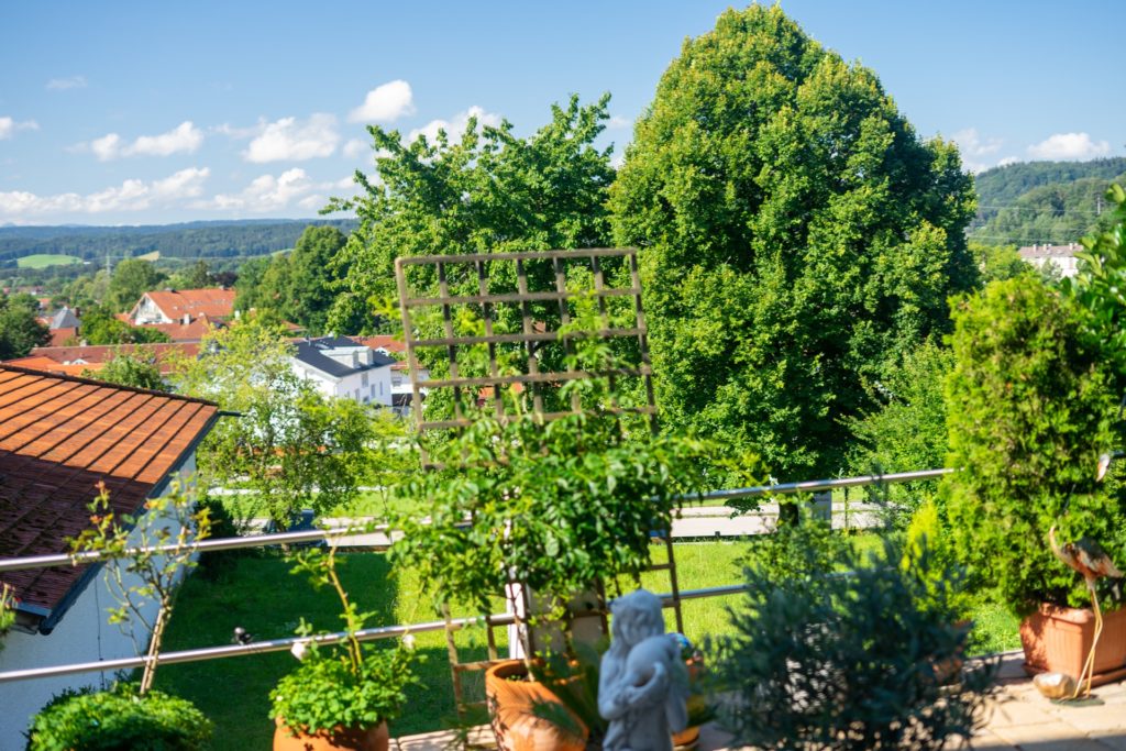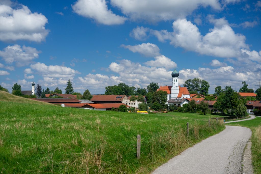Wir folgen weiter dem Verlauf der Via Julia und dem Mangfallradweg. Nur leider lässt sich die Mangfall nicht ein einziges Mal Blicken. Dafür kommen wir vorbei an kleinen Dörfen, die sich vor dem blauen Himmel und der grünen Landschaft malerisch vor uns ausbreiten.