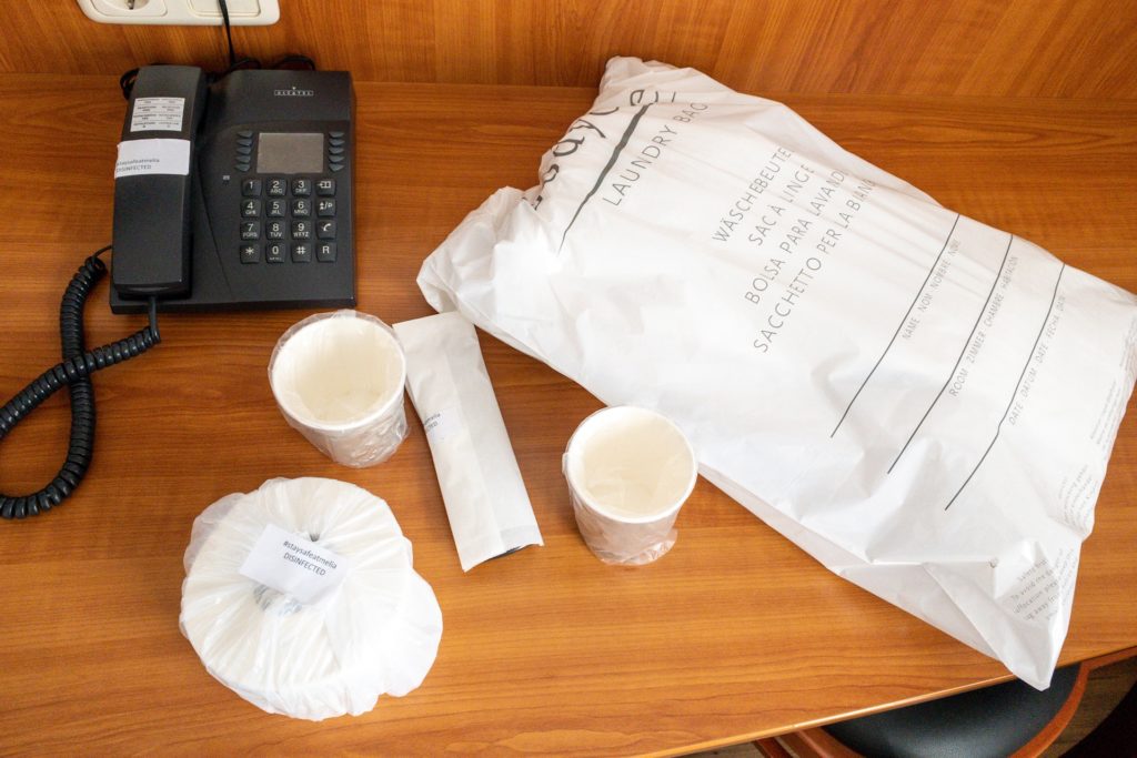 Um 16 Uhr fahren wir die letzten Kilometer zu unserer Unterkunft. Auf dem Weg werden wir an einer Ampel gefragt, ob wir Weit-Radler wären. Schon irgendwie. Die Dame zeigt sich von der Alpenüberquerung sichtlich beeindruckt. Wir erreichen das Tryp Hotel unweit des Hauptbahnhofes und bekommen ein kostenloses Upgrade auf ein Superiorzimmer, ganz nett für den letzten Tag unserer Reise. Der Check-In erfolgt natürlich mit Maske, die wir im gesamten Hotelbereich tragen sollen. Unsere Räder können wir kostenlos in der Tiefgarage unterstellen. Im Zimmer dann die Überraschung, alles ist Covid-19 konform verpackt und desinfiziert.