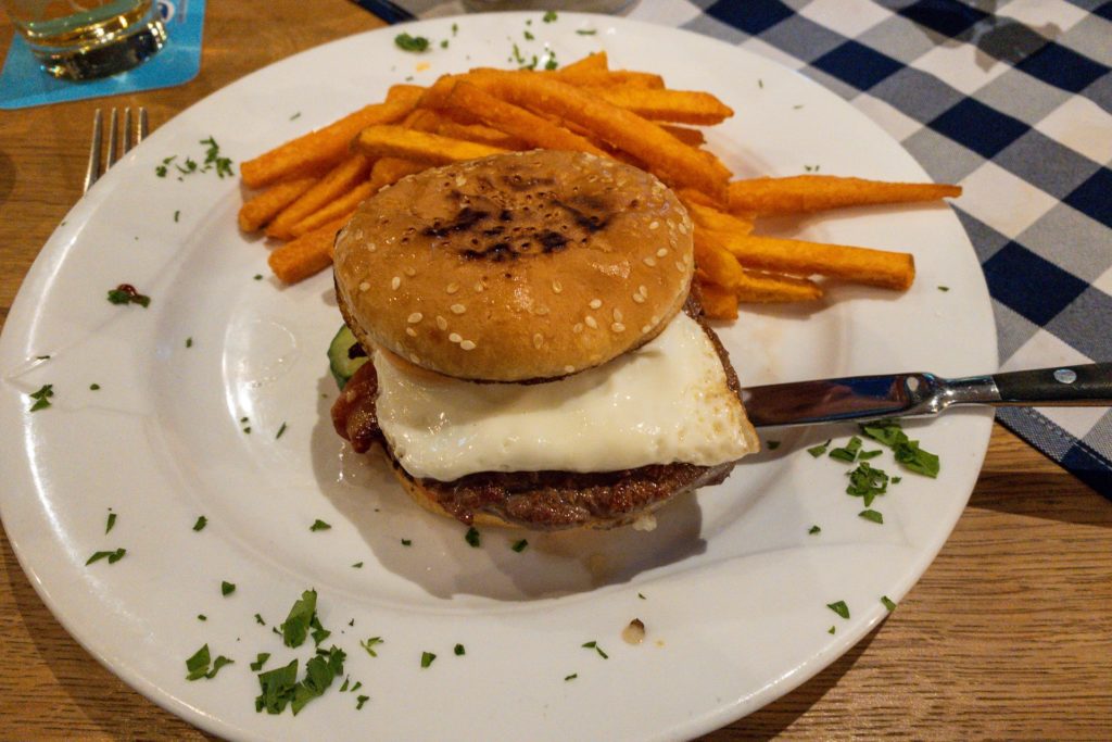 Am Abend machen wir uns auf die Suche nach etwas essbarem. Franks kulinarische Landkarte hat für München leider einen großen weißen Fleck. Zum Glück kann uns aber Sibylle aushelfen, die bis vor kurzem in München gelebt hat. Also schlendern wir entspannt zu S‘ Mailinger ca. 2,5 Kilometer vom Hotel entfernt. Da unser Mittagessen aus einem Kaffee und Croissant bestand, haben wir ordentlichen Hunger. Christian nimmt einen Schweinsbraten und ich den Steakburger. Formidable rosa gebratenes Fleisch und richtig gute Pommes aus Süßkartoffeln, sehr lecker.