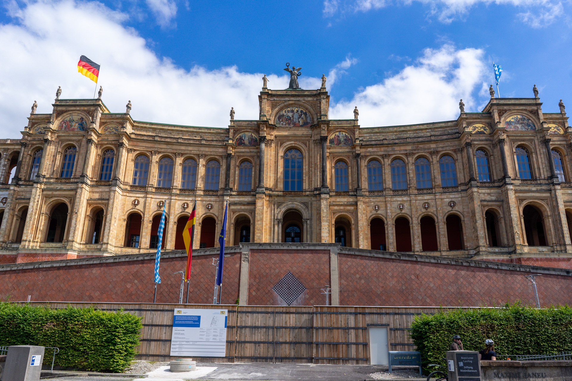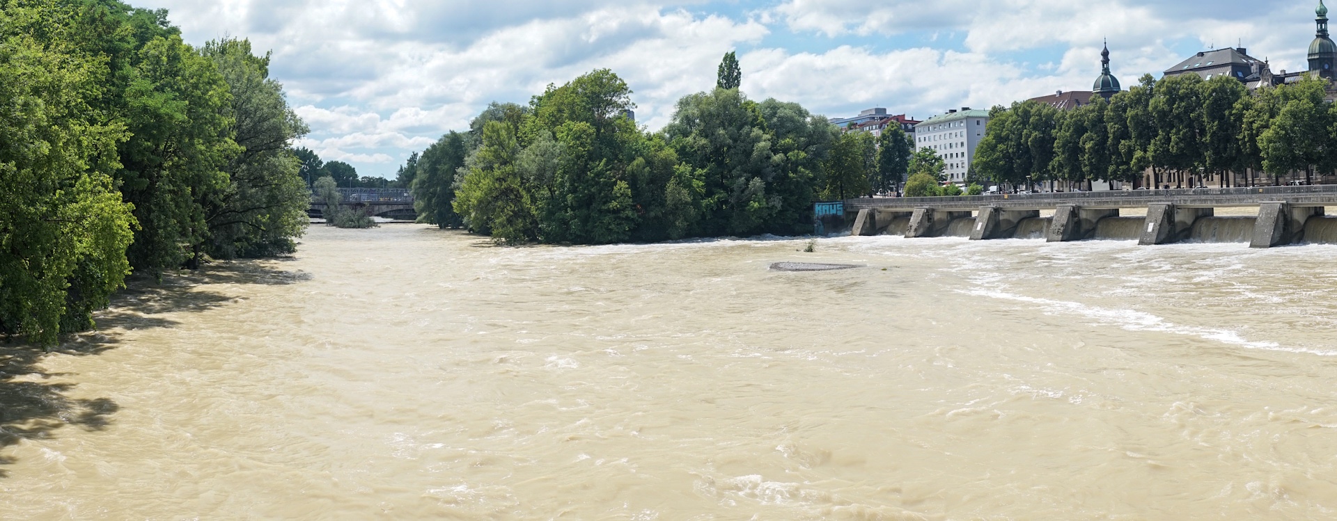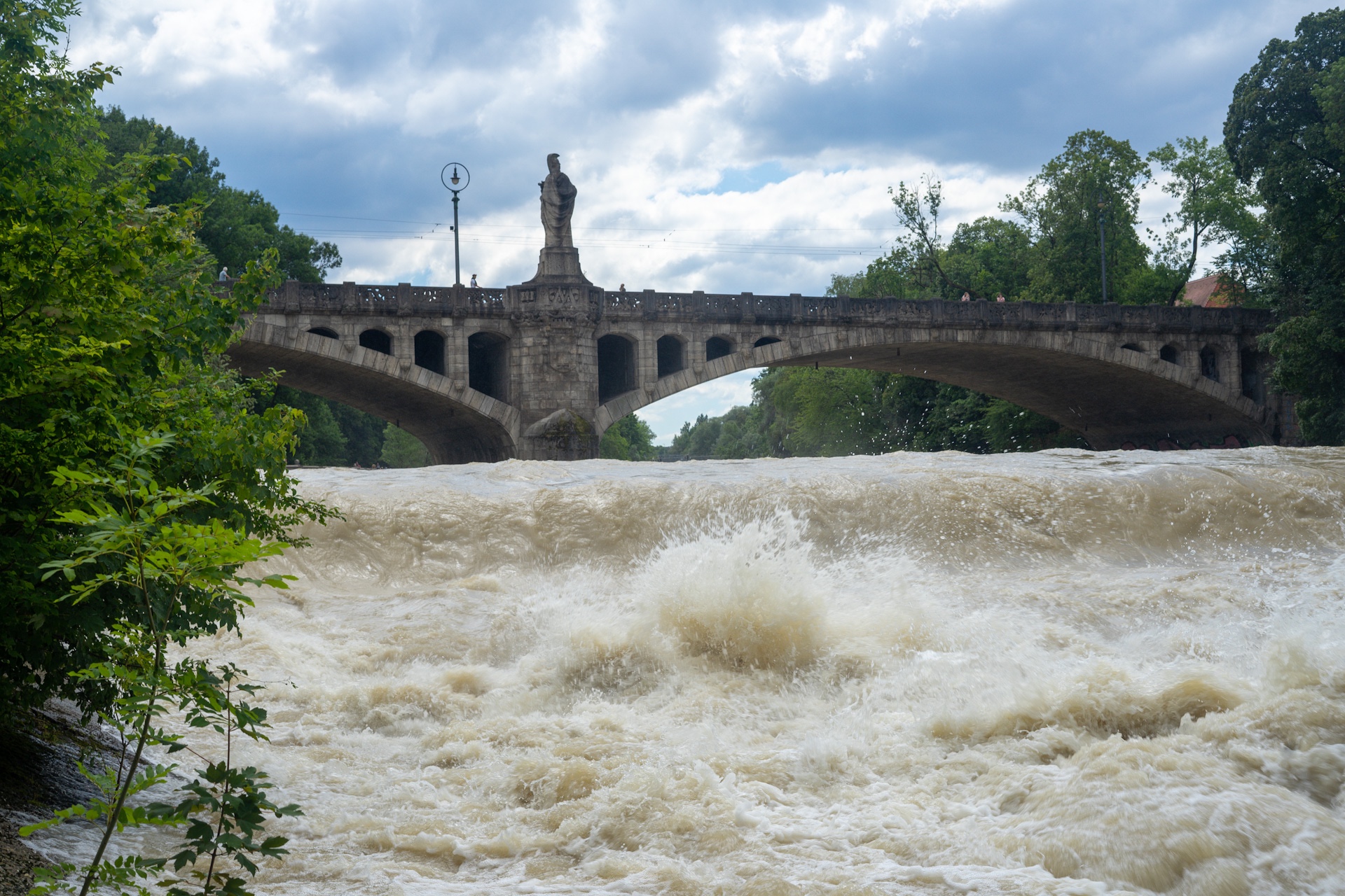 Auch in München spürt man die Folgen des Unwetters. Die Isar strömt ungestüm durch München und wann immer wir in ihrer Nähe sind, hört man sie tosen. Es ist noch vor 15 Uhr und wir können noch nicht in unserem Hotel einchecken. Also fahren wir an der Isar entlang, ab von unserer Route und suchen uns ein sonniges Plätzchen in den Maximiliansanlagen unweit des bayerischen Landtags.