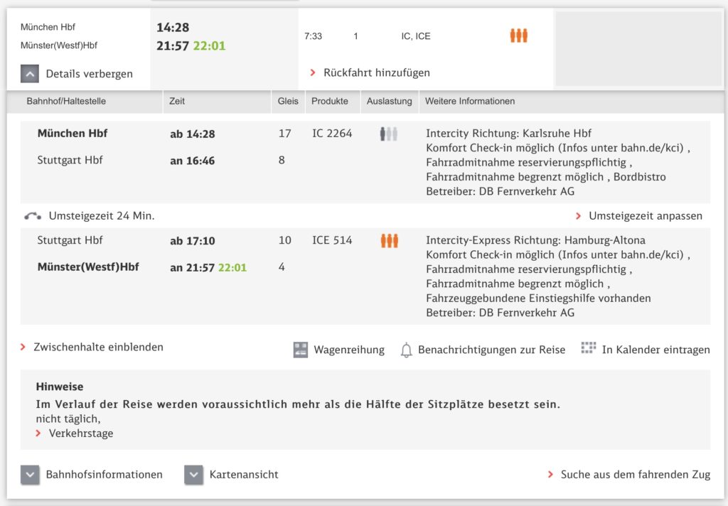 Heute ist unsere Fahrt deutlich entspannter. Wir starten erst am Nachmittag, haben nur einen Umstieg und die Umstiegszeit ist so unkritisch, dass wir uns in Stuttgart sogar noch etwas zum Abendessen organisieren können. Beide Bahnhöfe sind, wie schon erwähnt, Kopfbahnhöfe, sodass wir Barrierefrei ein- und später auch umsteigen können. Der ICE ist auf dem neuesten Stand, deshalb ist auch eine Fahrradmitnahme möglich. Wir haben auf weiten Teilen der Strecke sogar passables WLAN, sodass ich diesen Bericht nebenbei hochladen kann.