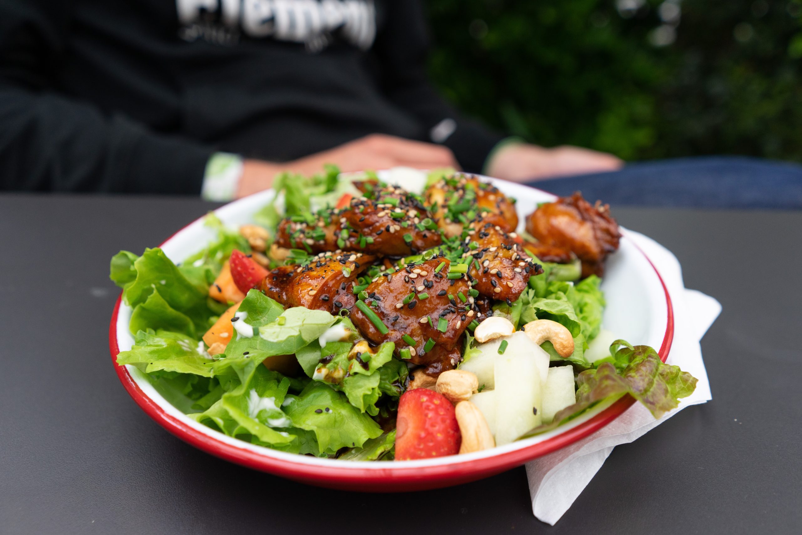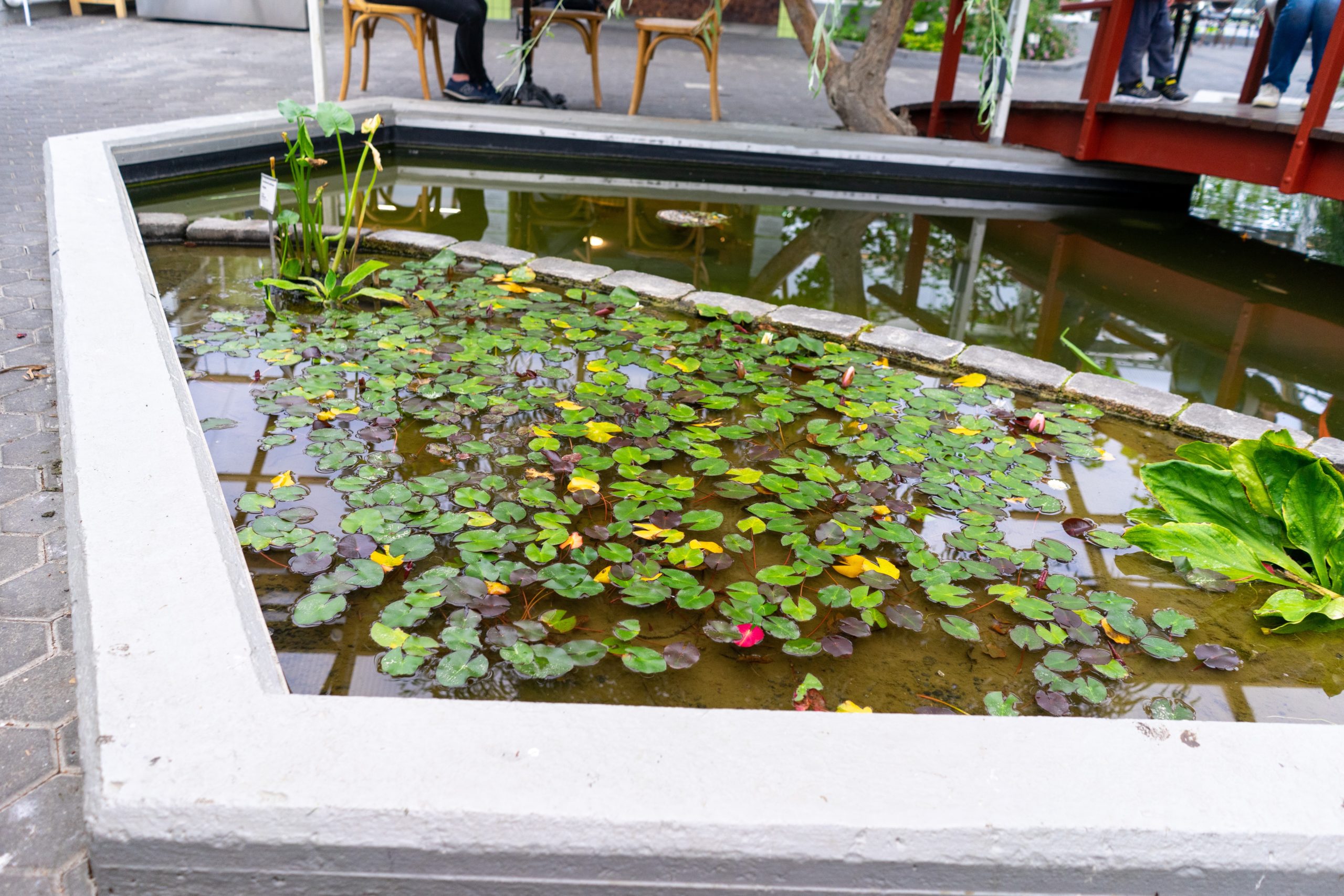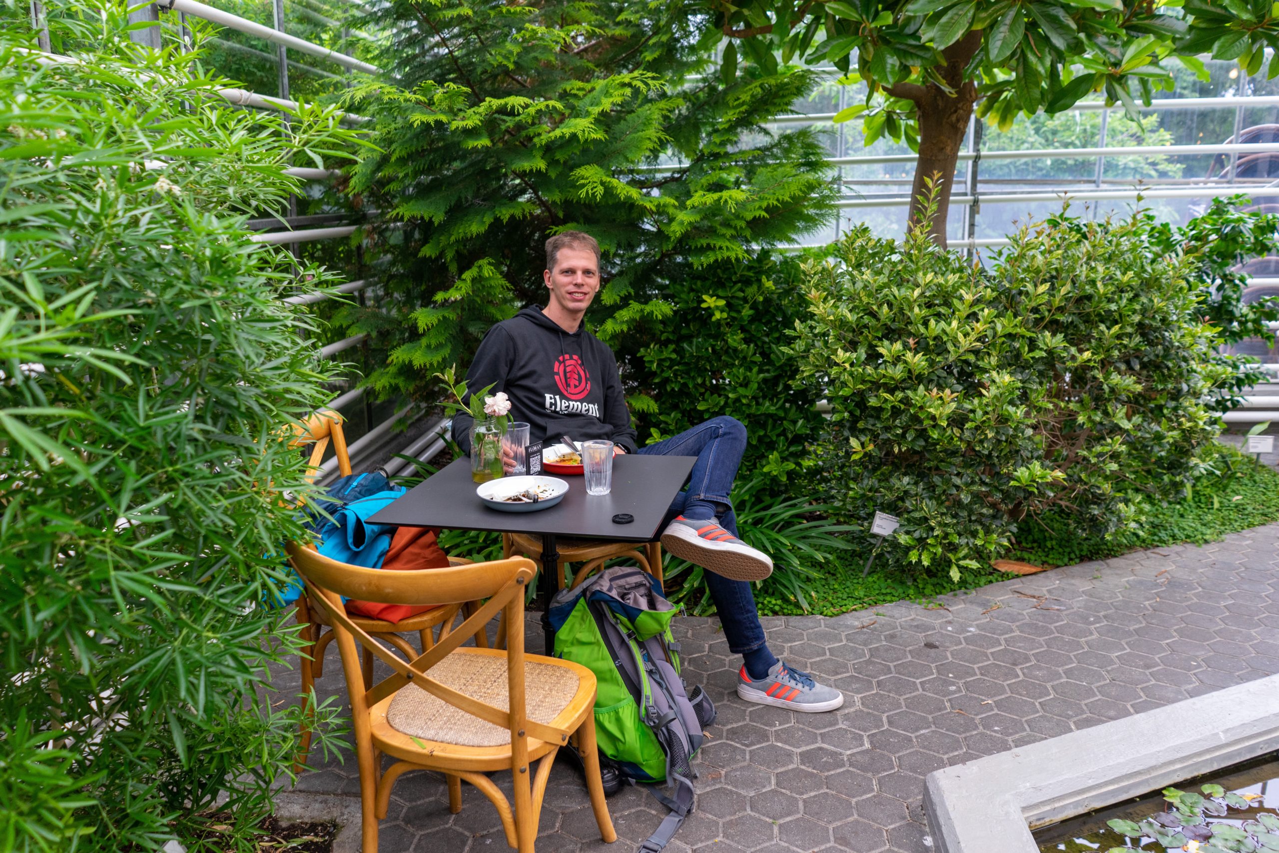 Zum Abschluss des Tages schauen wir uns den Botanischen Garten an, in dem in einem Gewächshaus ein nettes Bistro ist. Christian nimmt den Sommersalat mit Hähnchen und ich bestelle ein Gericht mit Schweinefleisch. Beides ist ganz gut gemacht, aber auch nicht überragend. Schön ist hingegen die tolle Atmosphäre im Gewächshaus. Das angenehme Klima und das Plätschern des Teichs lassen die Zeit wie im Flug vergehen.