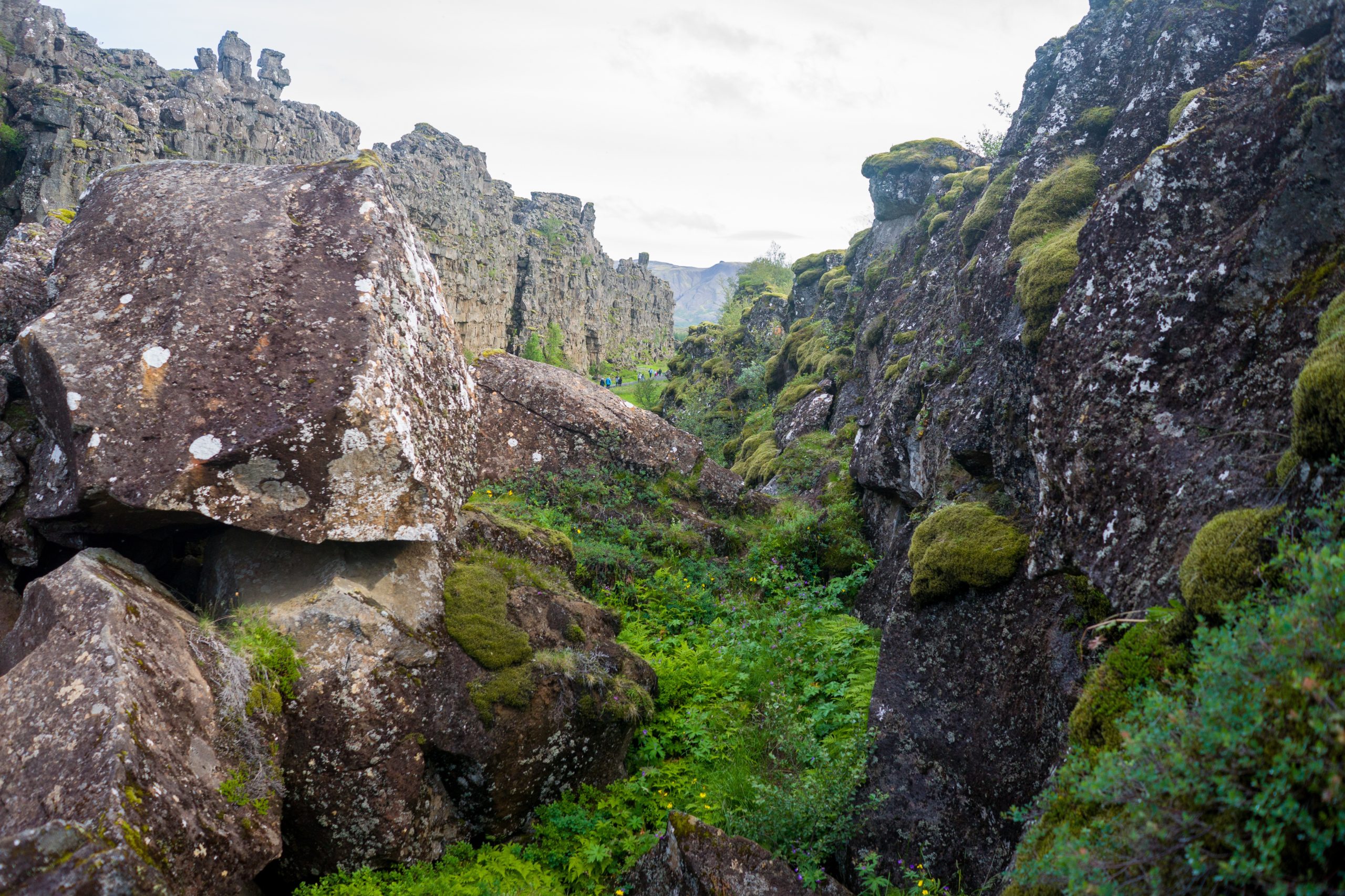 Aber nun erstmal der Reihe nach. Wir werden direkt vom Hotel abgeholt und fahren zum Þingvellir (Thingvellir). Das Herz der isländischen Republik und das älteste, noch existierende Parlament wurde hier im Jahr 930 zum ersten Mal abgehalten. Ein wahrhaft magischer Ort. Von unserem ersten Stop haben wir eine wundervolle Aussicht über das gesamte Tal, in dem die Amerikanische und die Eurasische Platte aufeinander treffen und jedes Jahr einige Milimeter Auseinanderdriften. Das führt zu sehr geraden Abbruchkanten und verschiedenen Canyons im gesamten Tal.