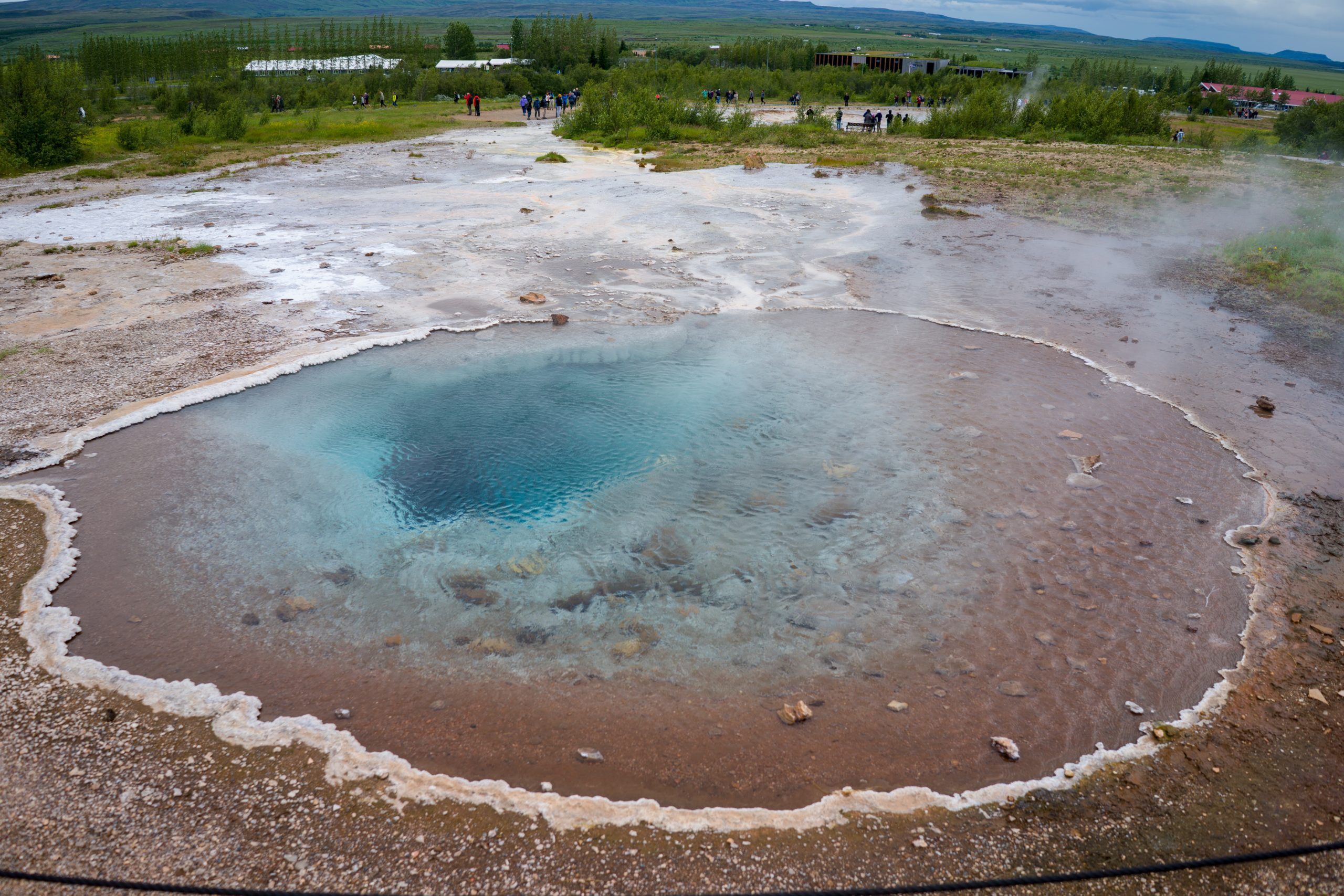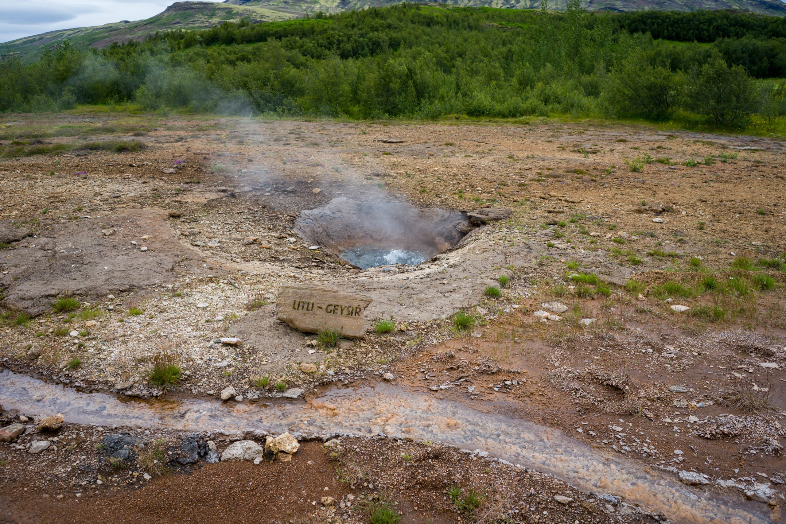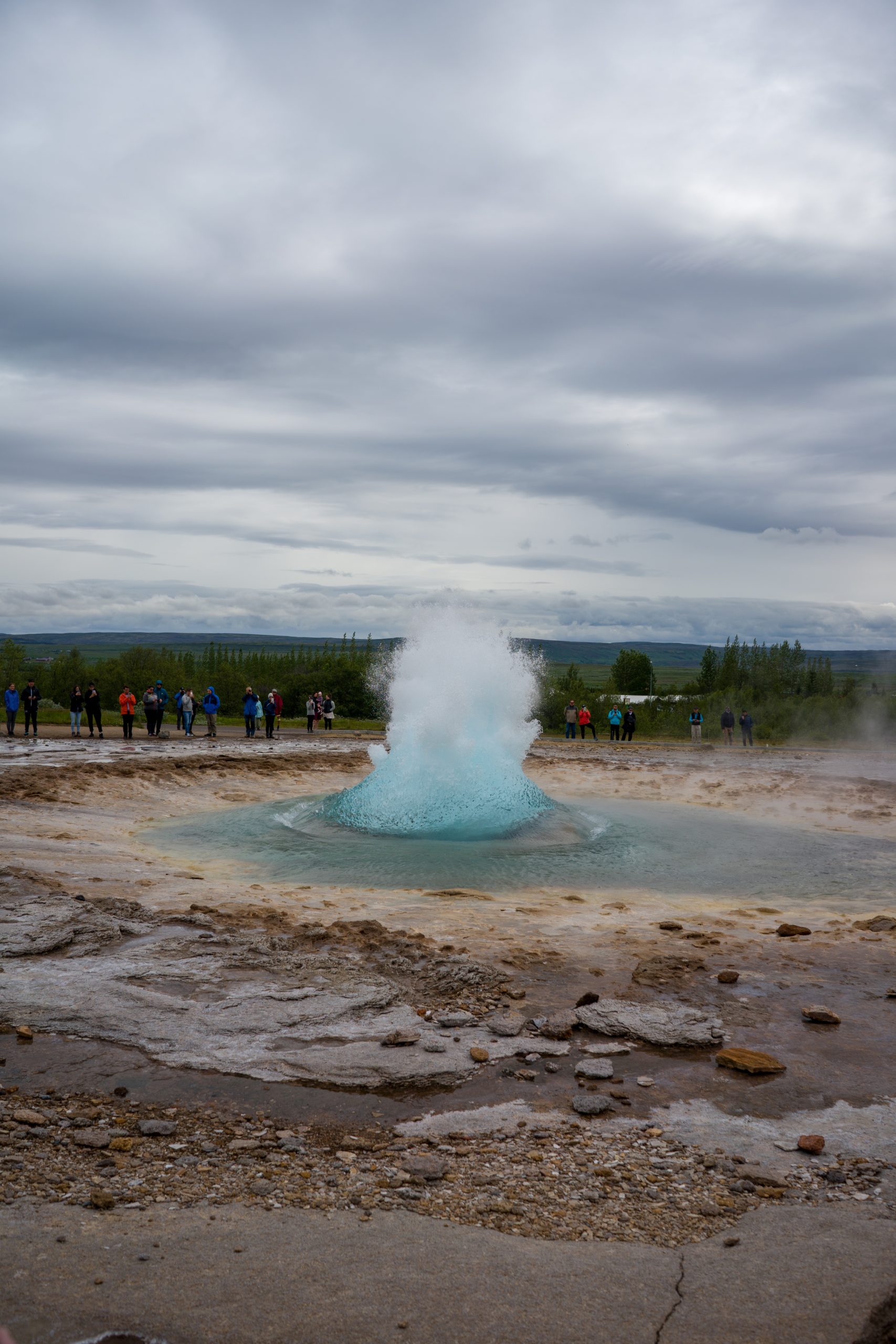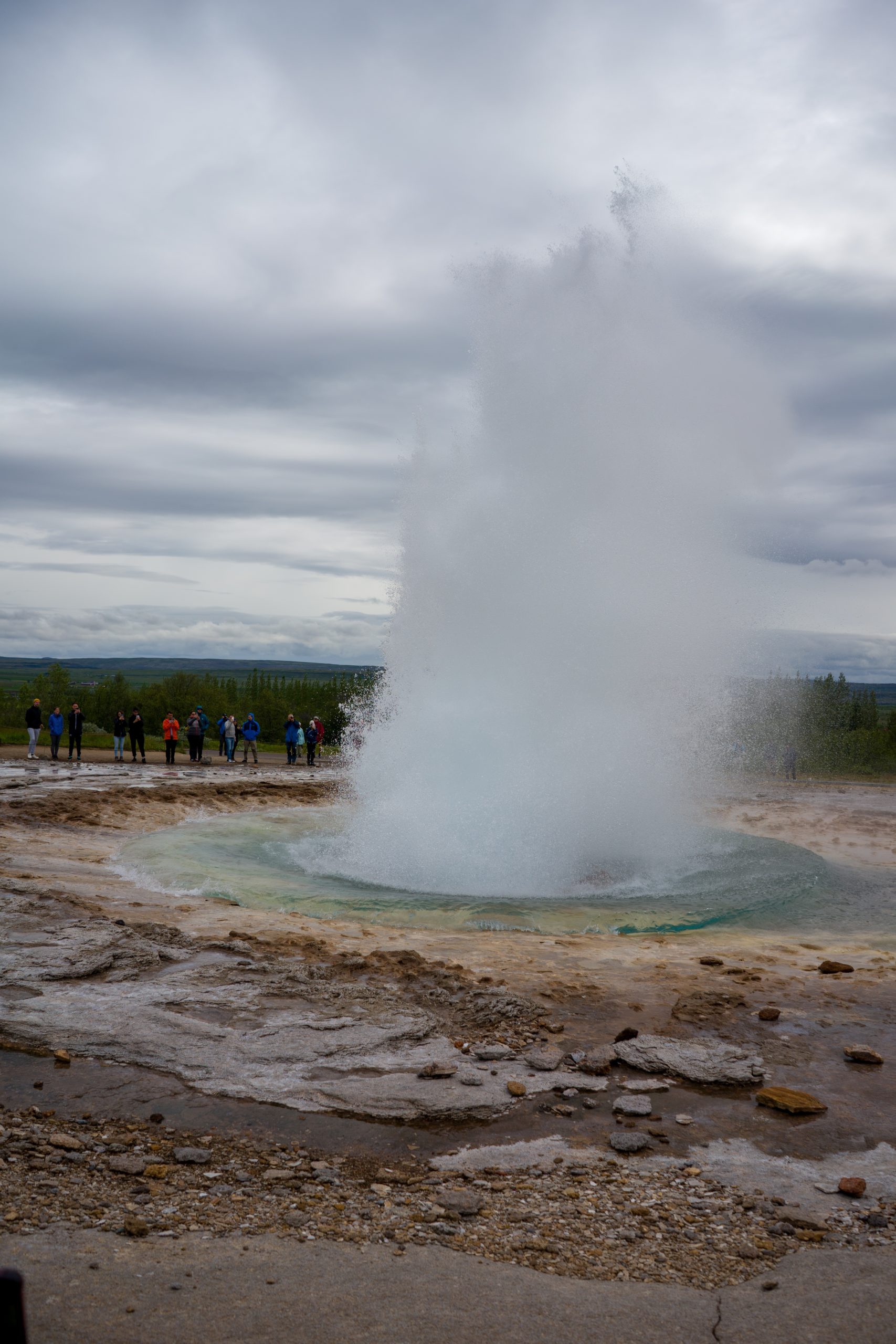 Der zweite Tagesstopp ist Geysir. Der eine ursprüngliche Geysir, der allen anderen seinen Namen gab. Leider ist dieser nicht sonderlich spannend, da er seit 1915 schlafend ist. Nach einem Erdbeben im Jahr 2000 ist er zwar wiede aktiv, bricht aber so gut wie gar nicht mehr aus. Sein kleiner Bruder Strokkur, der nur einige Meter entfernt ist, spritzt in Abständen von 7-10 Minuten regelmäßig 25-35 Meter hohe kochende Wassersäulen in die Luft. Ein wirklich beeindruckendes Schauspiel.