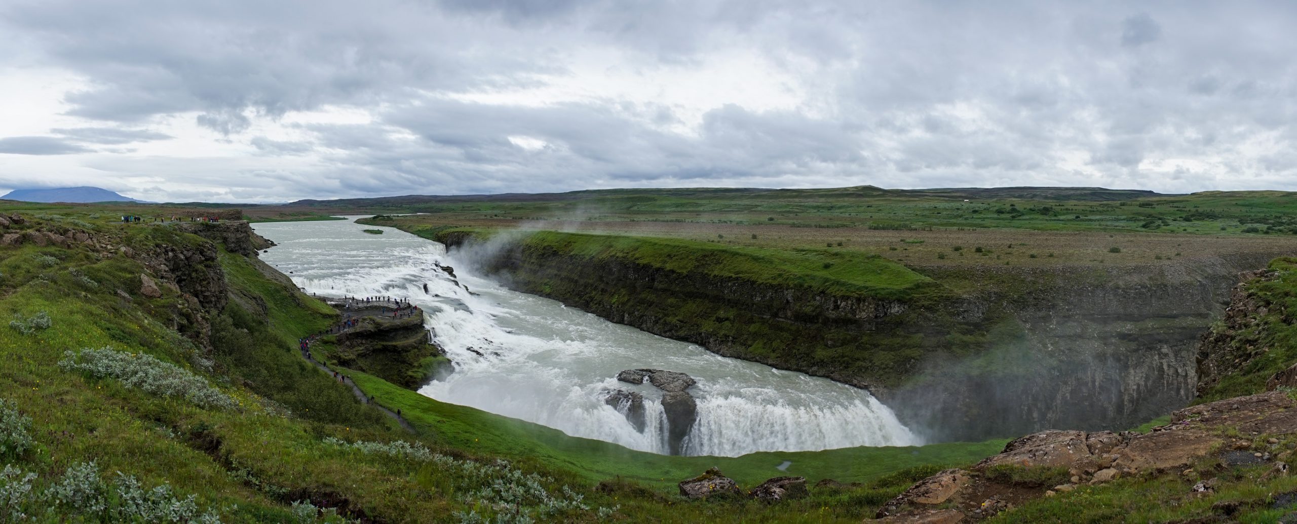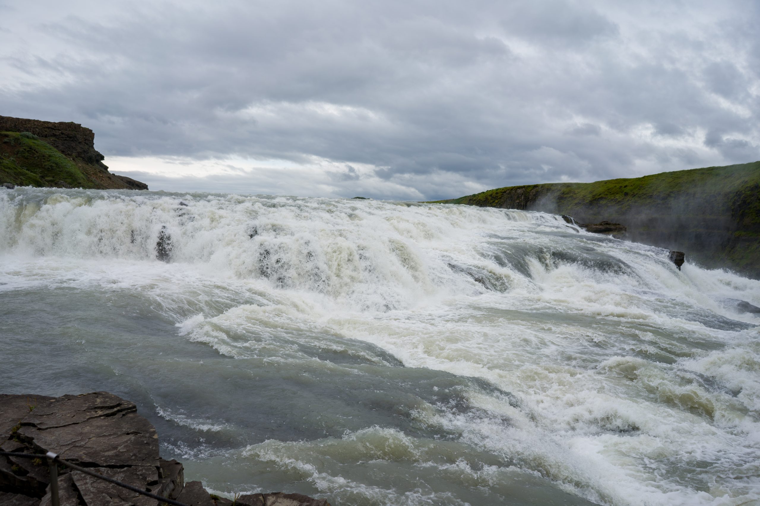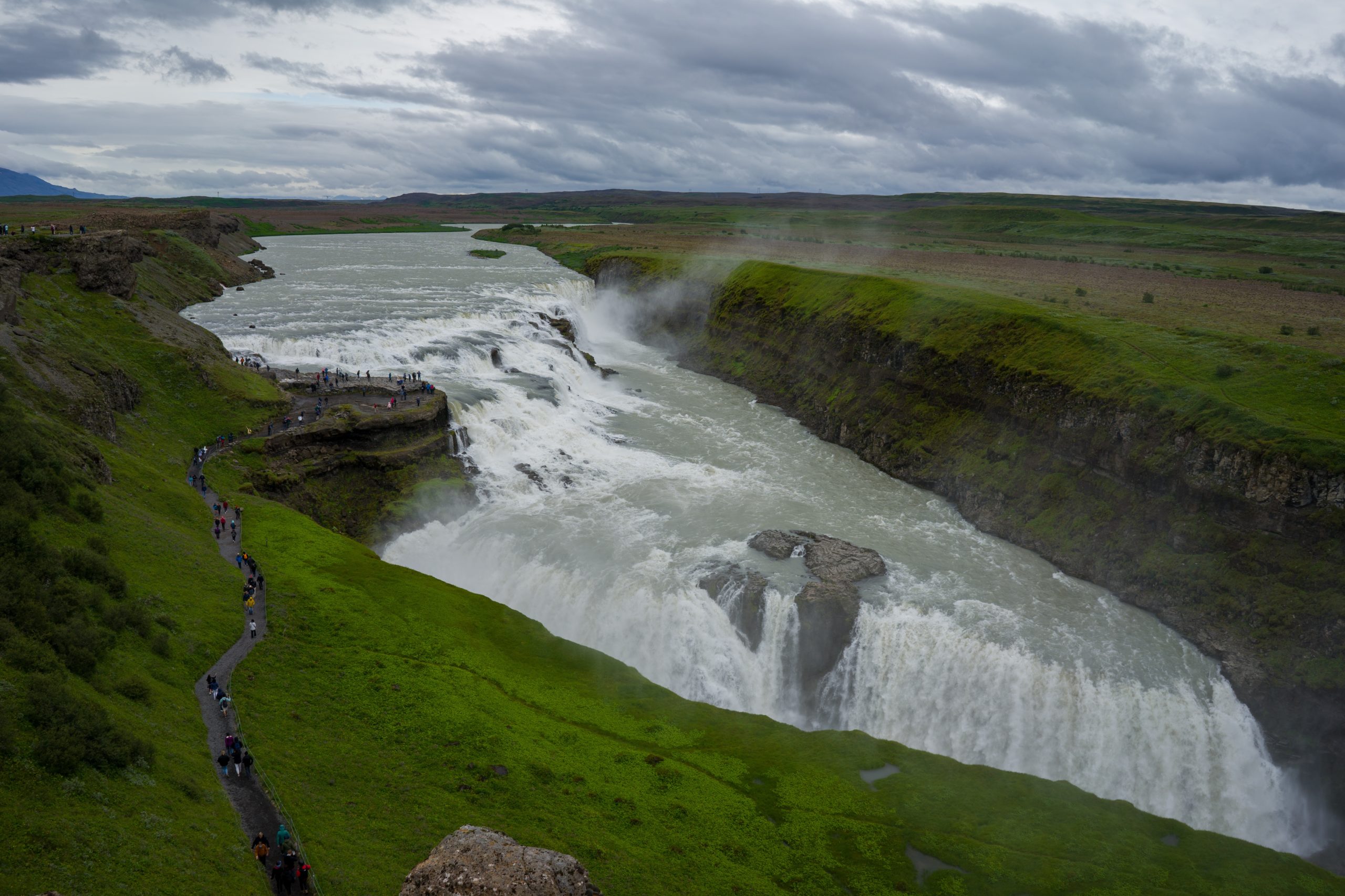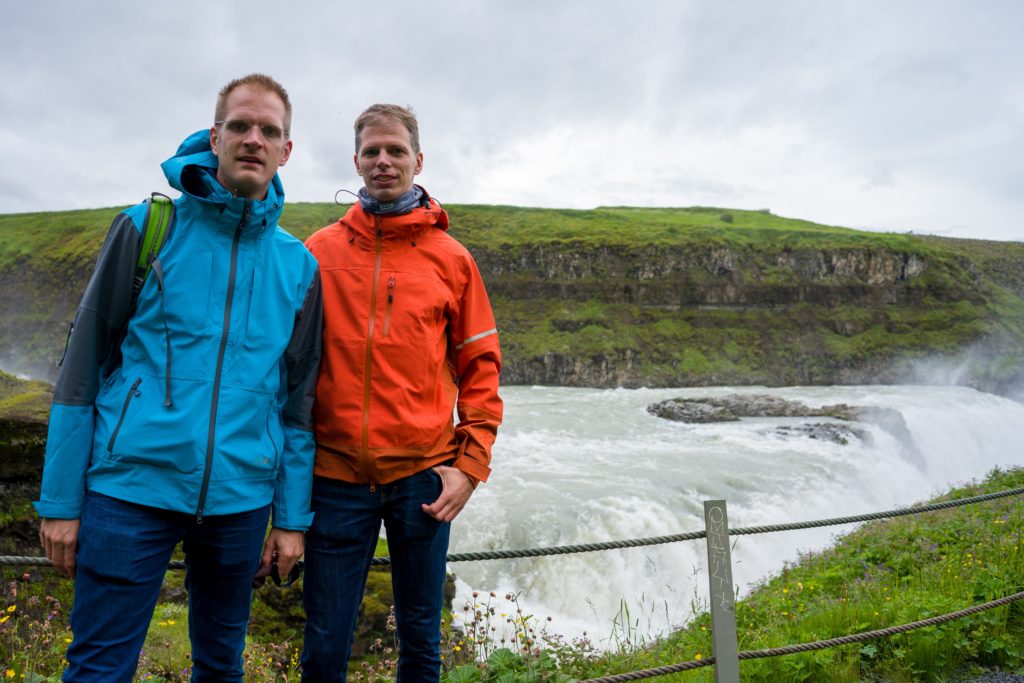 Unser nächster Stop ist ebenfalls ein sehr touristischer, der Gullfoss. Wenngleich nicht der höchste Wasserfall, gehört er doch zu den beeindruckendsten. Seine zwei Stufen stehen nahezu im rechten Winkel zueinander. Durch seine Breite von gut 200 Metern fließen hier beeindruckende Wassermengen ins Tal.