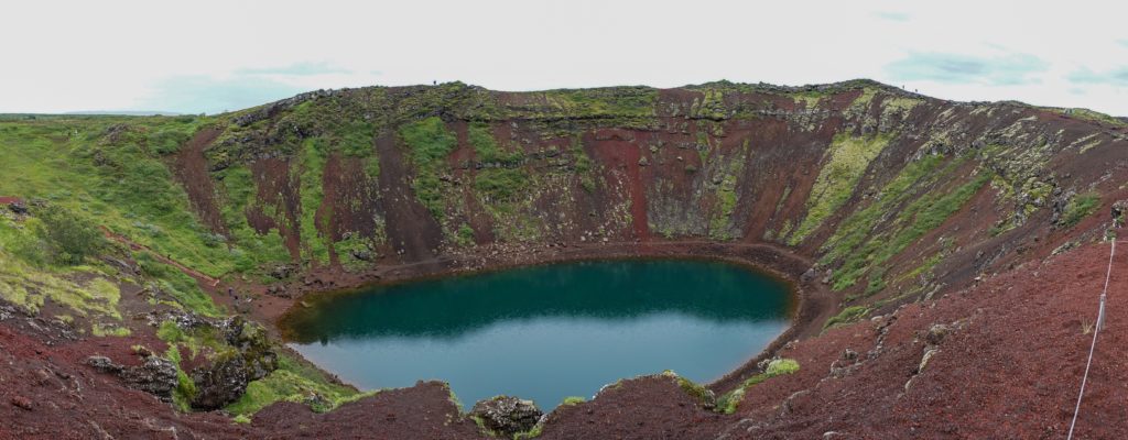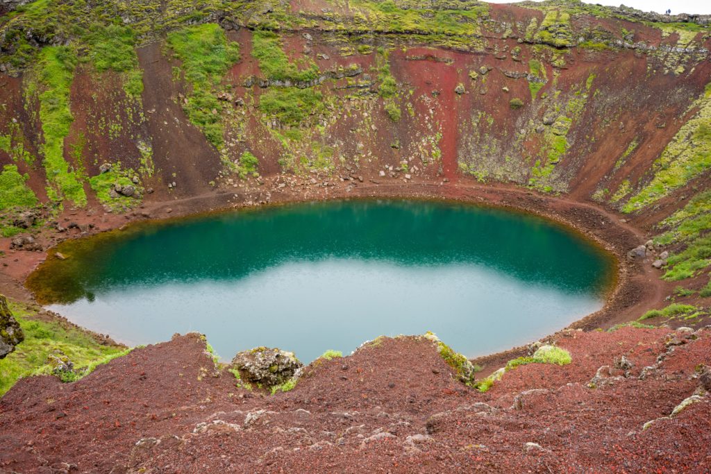 Passend zum letzten Stop des Tages, hat der Regen fast aufgehört. Der Kerið Kratersee, auch genannt das Auge der Welt, wartet schon auf uns. Auch wenn wir hier nur kurz verweilen ist die Kulisse doch atemberaubend.