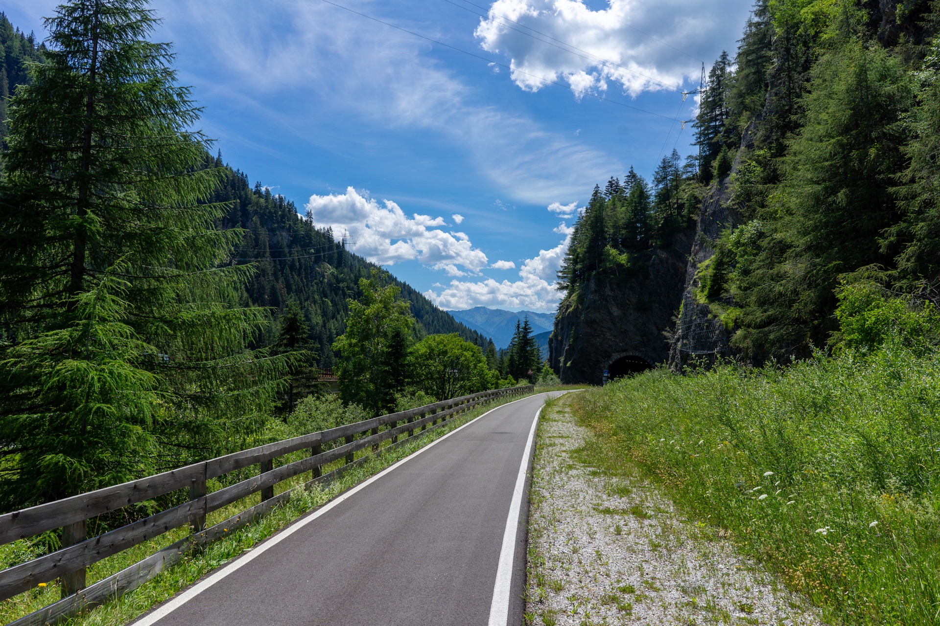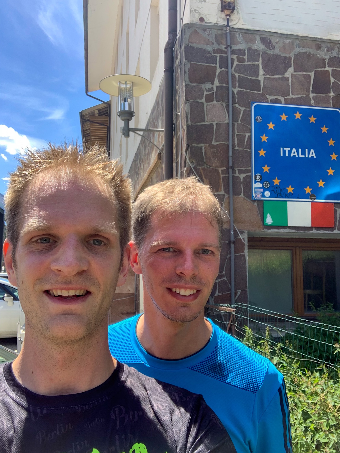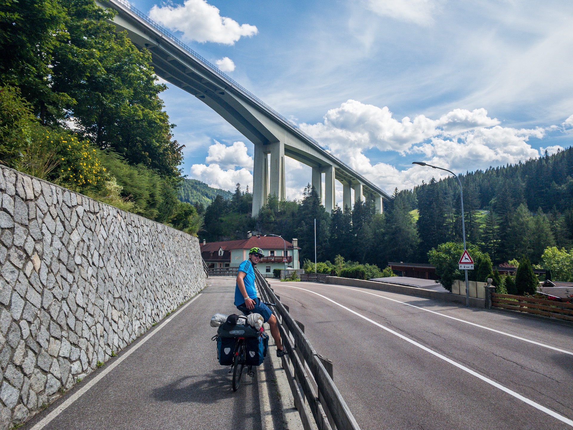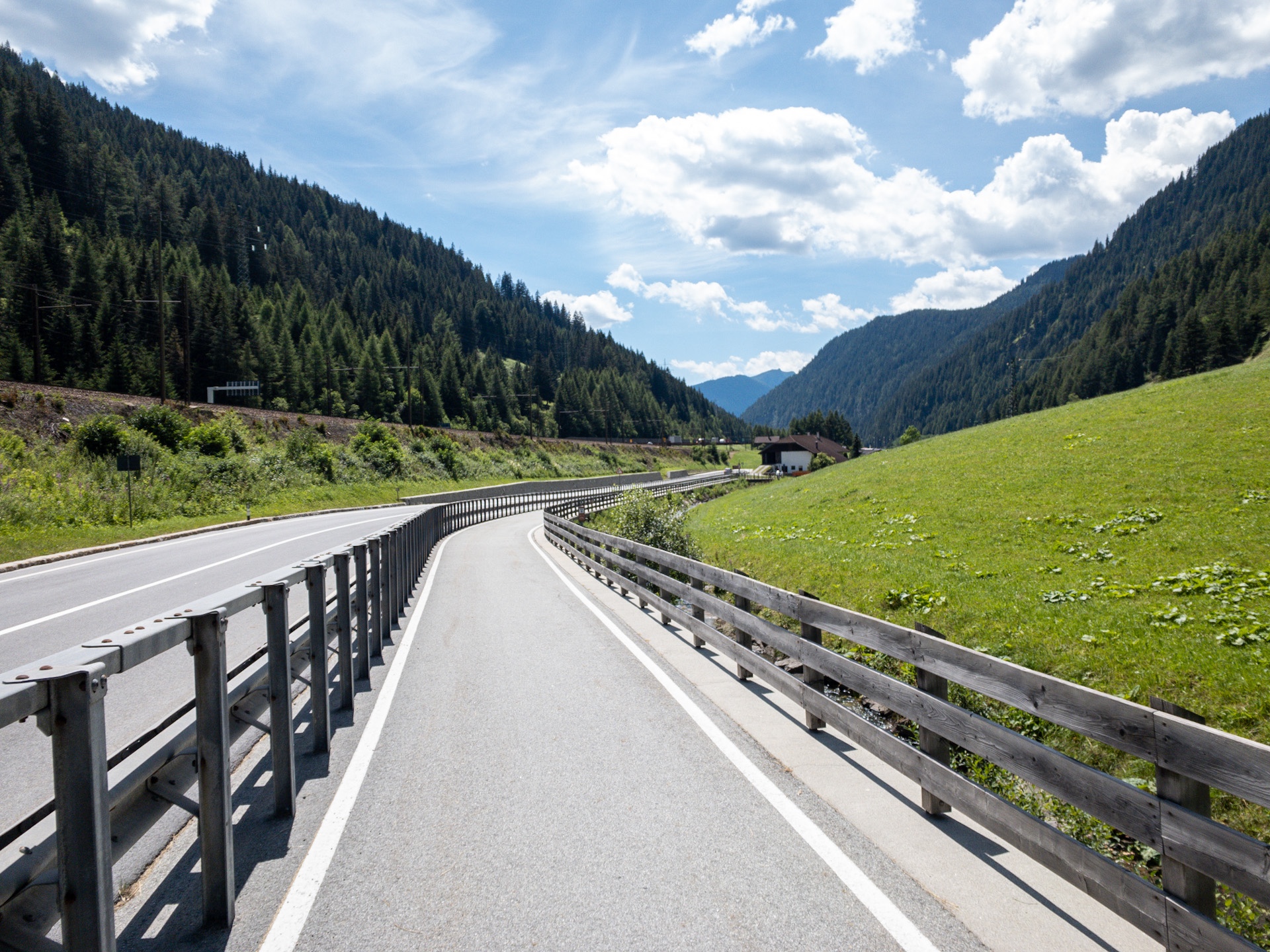 Wir haben das Wasser gleich mehrfach auffüllen müssen. Auf Rund 1400m ü.Nn erreichen wir um ca 13:30 Uhr Brenner und sind damit in Italien. Genauer gesagt Norditalien, also streng genommen Südtirol, in dem alles so Aussieht, als sei es Südösterreich. Deutsche Straßennamen, Geschäfte die Hofer oder Moosgruber heißen und alle sprechen Deutsch. Einziger Unterschied, hier und da entdeckt man italienische Übersetzungen der Schilder. Es ändert sich allerdings eine Menge, wenn man sich die Radwegführung auf der Südtiroler Seite des Brenners anschaut. Begrüßt werden wir von einer netten Radbahntrasse, die uns in sanften Kurven und mit wenig Gefälle den Berg hinter trägt. Nun können wir die Ausblicke wirklich genießen!