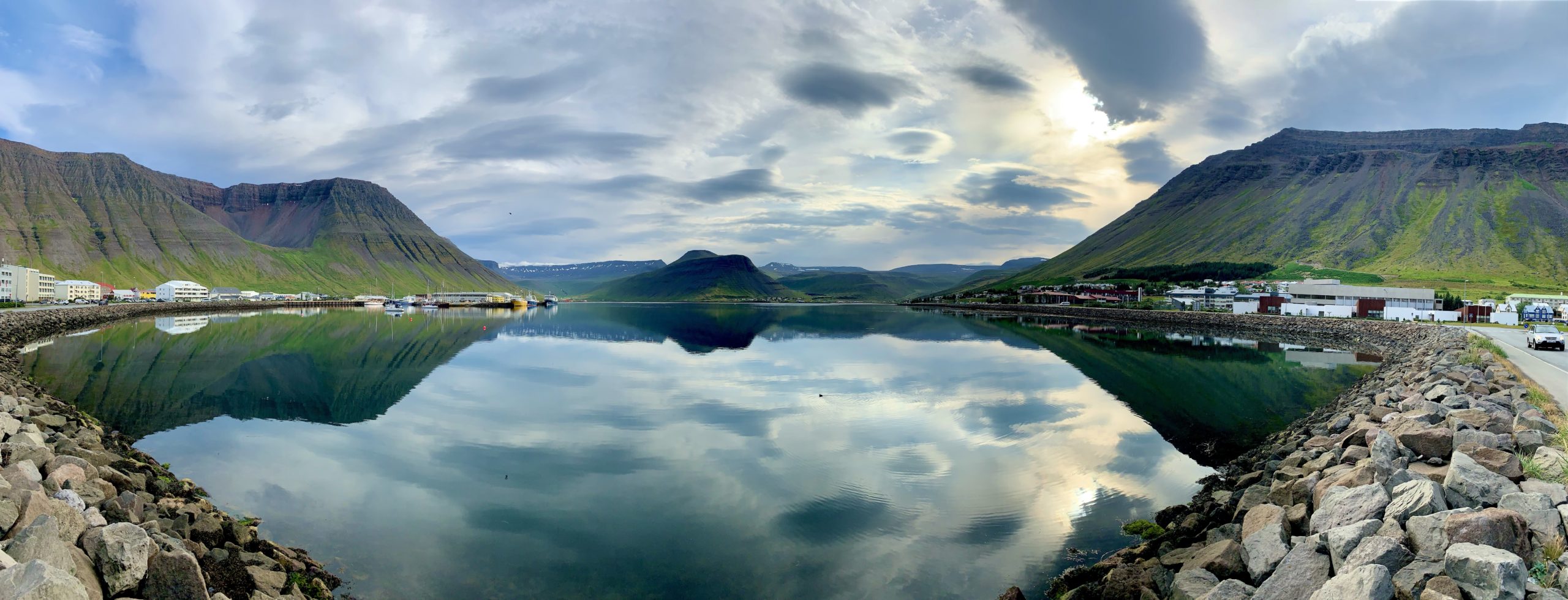 Ein wirklich schöner Flug endet an einem noch schöneren Ort. Eingezwängt zwischen zwei hochaufragenden Felsmassiven liegt Ísafjörður an einem schmalen Fjord. Mit dem Shuttlebus überwinden wir die 5 Kilometer in die Stadt in kürzester Zeit und checken in unser Guesthouse ein.