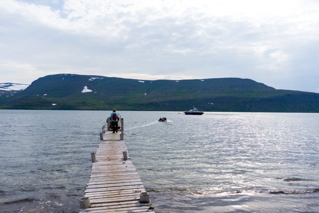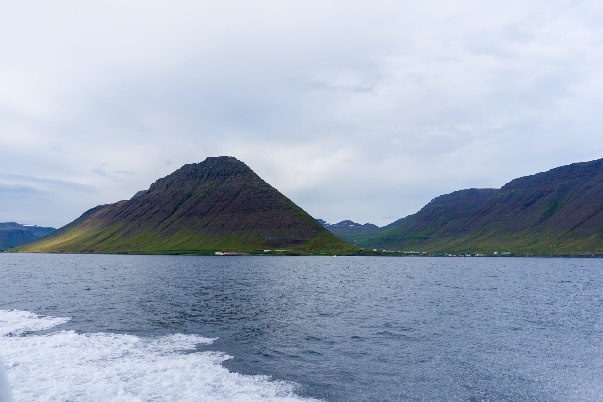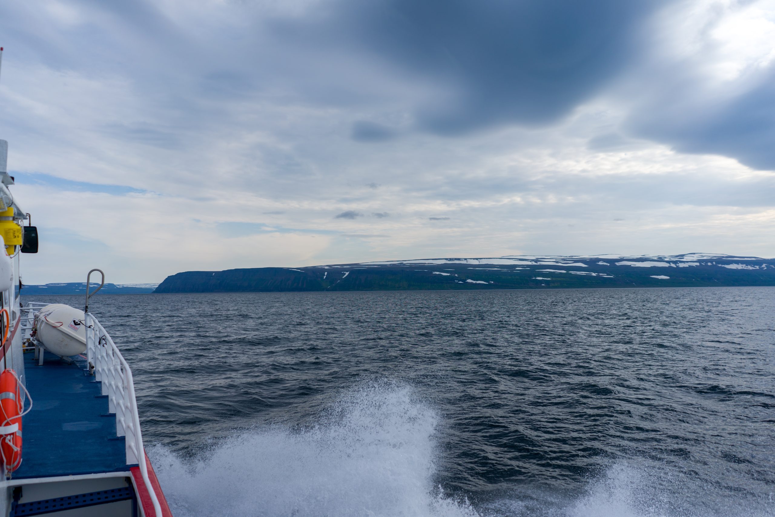Kaum haben wir diese hinter uns gelassen, fahren wir sehr zügig weiter. Das Wetter ist zwar bewölkt, doch die Sicht auf die umliegenden Berge ist dennoch gut. Das Boot stoppt unvermittelt. Der Kapitän gibt per Lautsprecher bekannt, dass sich direkt vor uns ein Wal befindet. Der Wal taucht noch zwei mal vor uns auf bevor er weiter zieht. Leider ist er zu weit entfernt, um ein Foto davon zu machen. Es ist dennoch eine schöne Erfahrung. Nach gut 1,5 Stunden kommen wir in Hesteyri an.