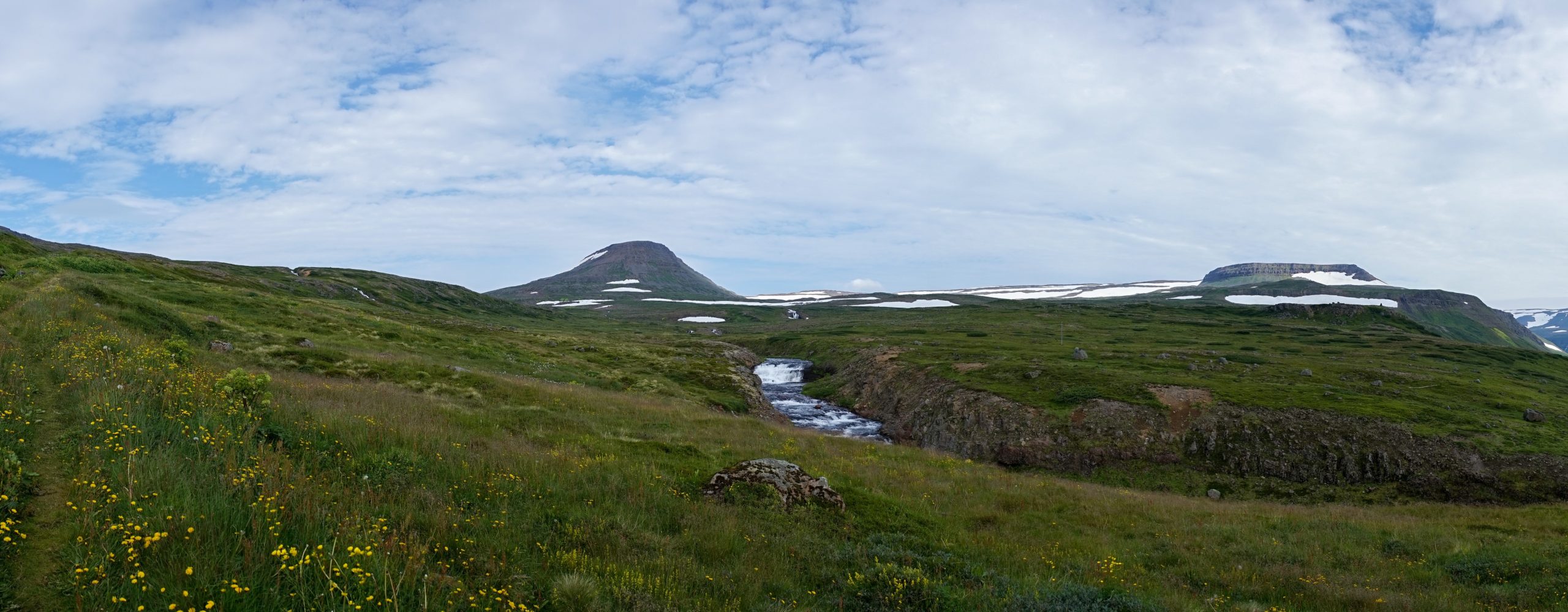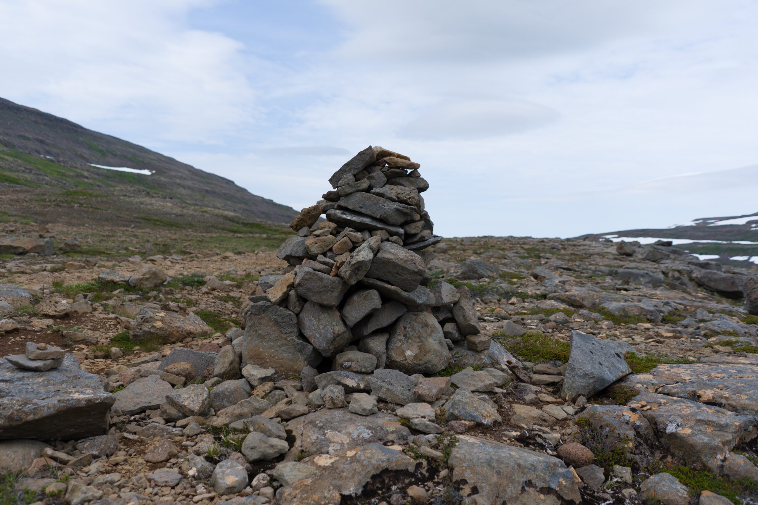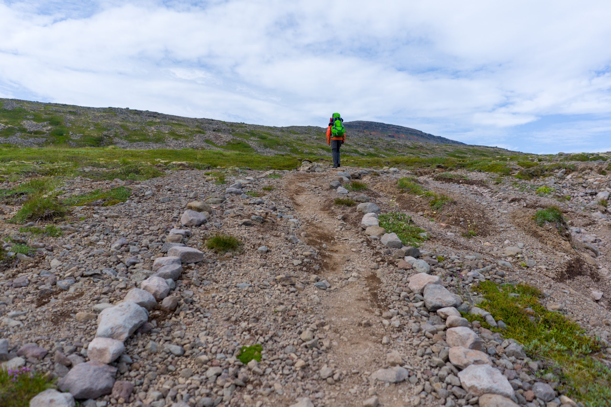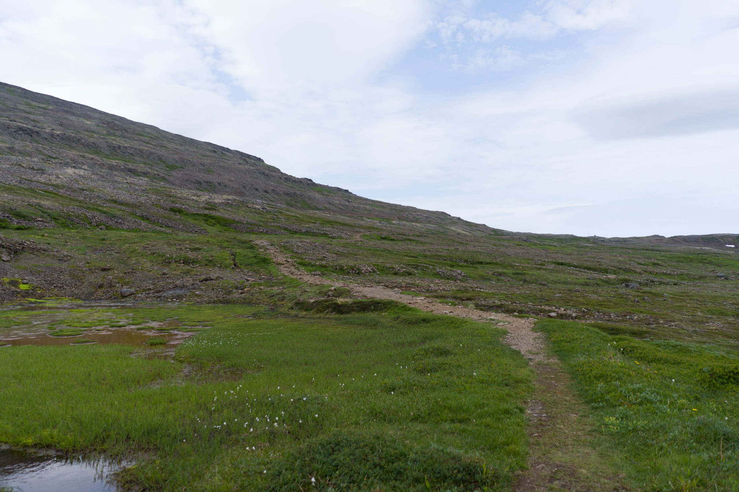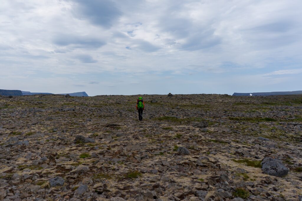Gut gestärkt und ohne andere Wanderer in Sichtweite wandern wir los Richtung Aðalvìk. Gute 10 Kilometer mit 20 Kilo Gepäck auf den Schultern. Der Himmel ist leicht wolkenverhangen, doch das schmälert kein bisschen die Schönheit dieses Ortes. Auf der gesamten Wanderung begegnet uns nur ein Pärchen, die anfangs die falsche Route genommen haben und nun wieder zurückwandern müssen. Verbindungen zwischen den einzelnen Wegen gibt es nämlich kaum welche. Zunächst wandern wir den Berg mit moderater Steigung hinauf auf einem gut markierten ausgetretenen Pfad. Hier entdeckt man eine schöne Aussicht nach der anderen.