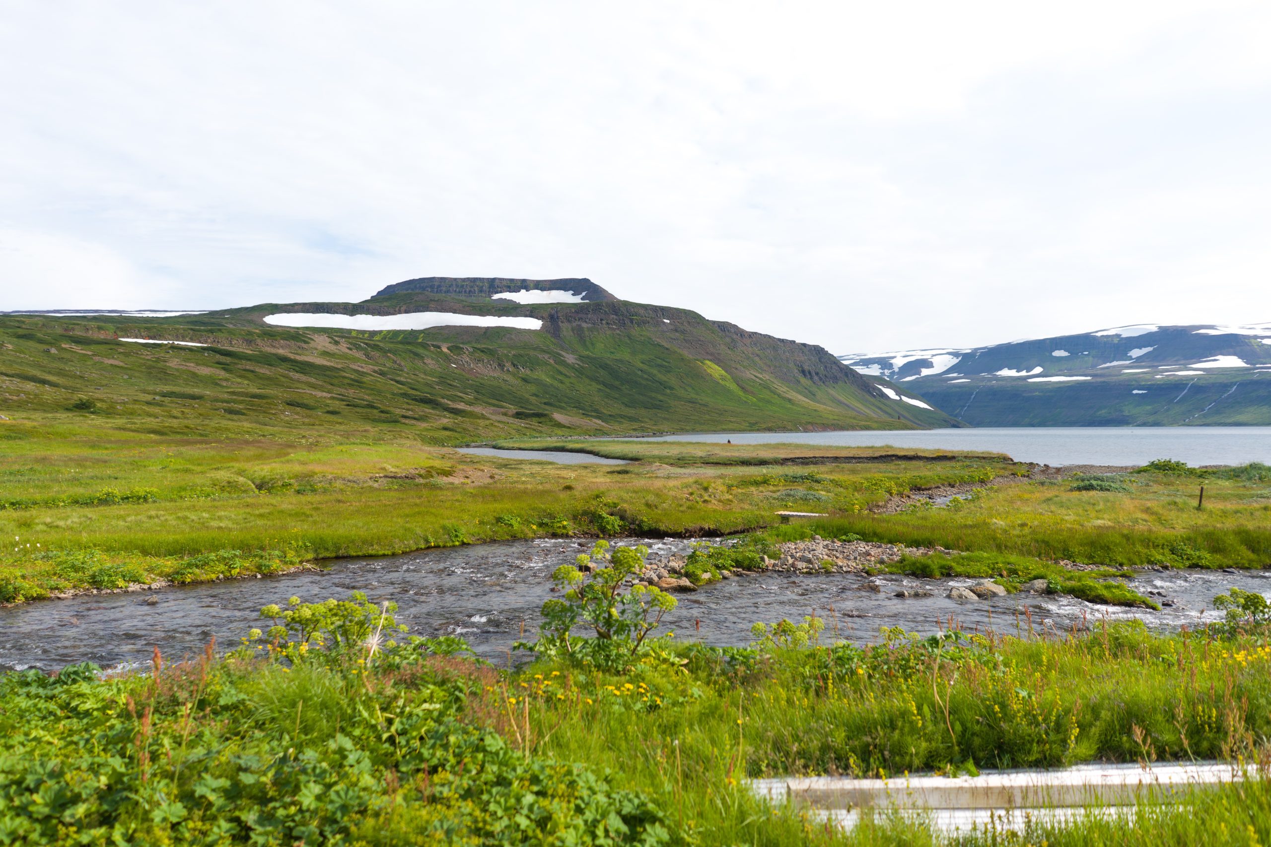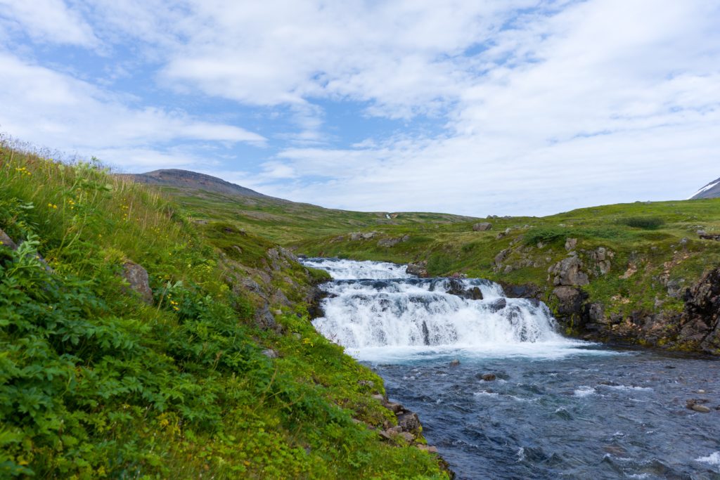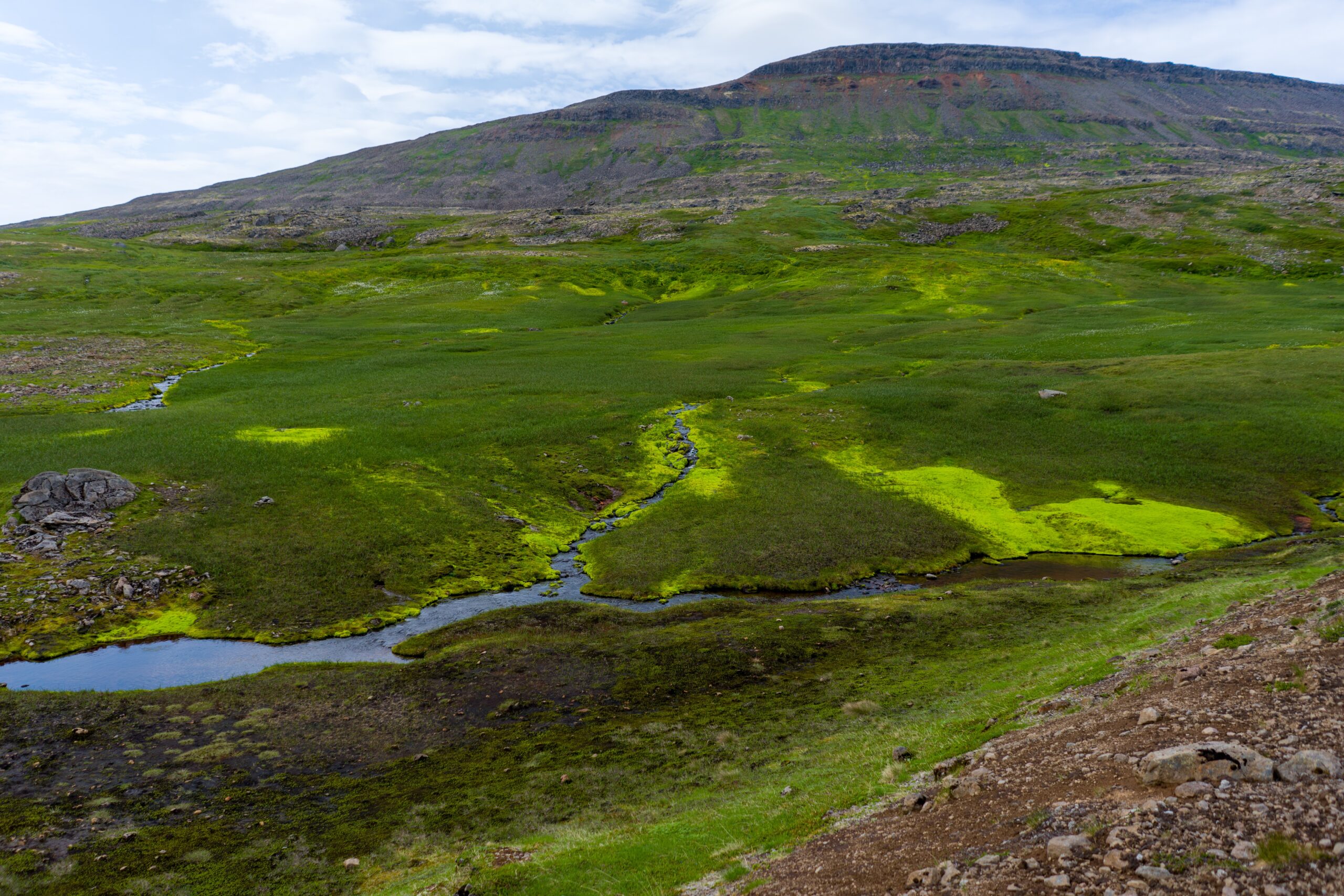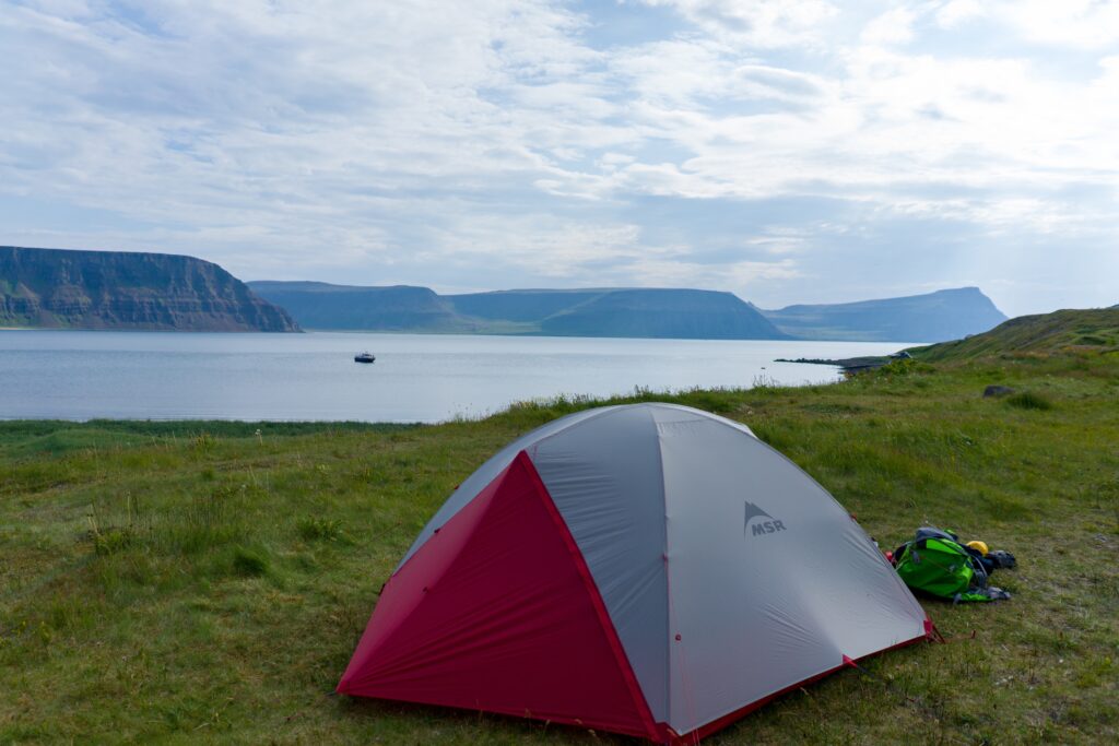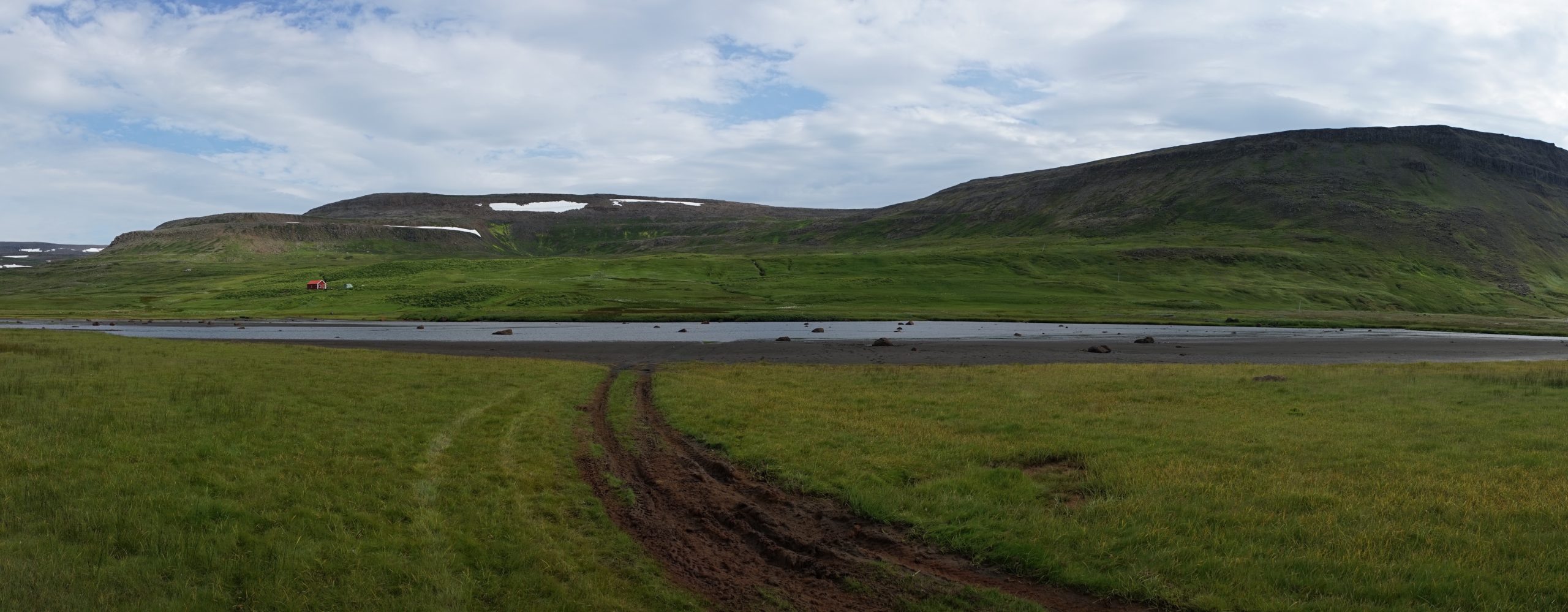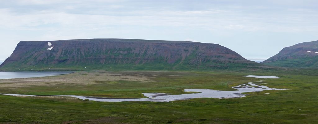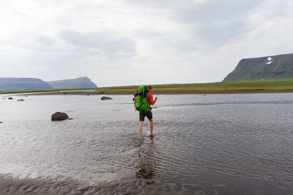 Gut gestärkt und ohne andere Wanderer in Sichtweite wandern wir los Richtung Aðalvìk. Gute 10 Kilometer mit 20 Kilo Gepäck auf den Schultern. Der Himmel ist leicht wolkenverhangen, doch das schmälert kein bisschen die Schönheit dieses Ortes. Auf der gesamten Wanderung begegnet uns nur ein Pärchen, die anfangs die falsche Route genommen haben und nun wieder zurückwandern müssen. Verbindungen zwischen den einzelnen Wegen gibt es nämlich kaum welche. Zunächst wandern wir den Berg mit moderater Steigung hinauf auf einem gut markierten ausgetretenen Pfad. Hier entdeckt man eine schöne Aussicht nach der anderen.