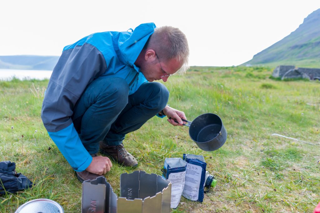 Angekommen am Ziel beginnen wir direkt unser Zelt aufzubauen und anschließend bereiten wir unseren ersten Beutel Trekkingnahrung zu. Deftiger Kartoffeltopf mit Rind und Bohnen ist leider so überhaupt nicht zu empfehlen. Die Bohnen schmecken sehr zäh, immerhin werden wir satt. Hoffentlich haben wir morgen mehr Glück.