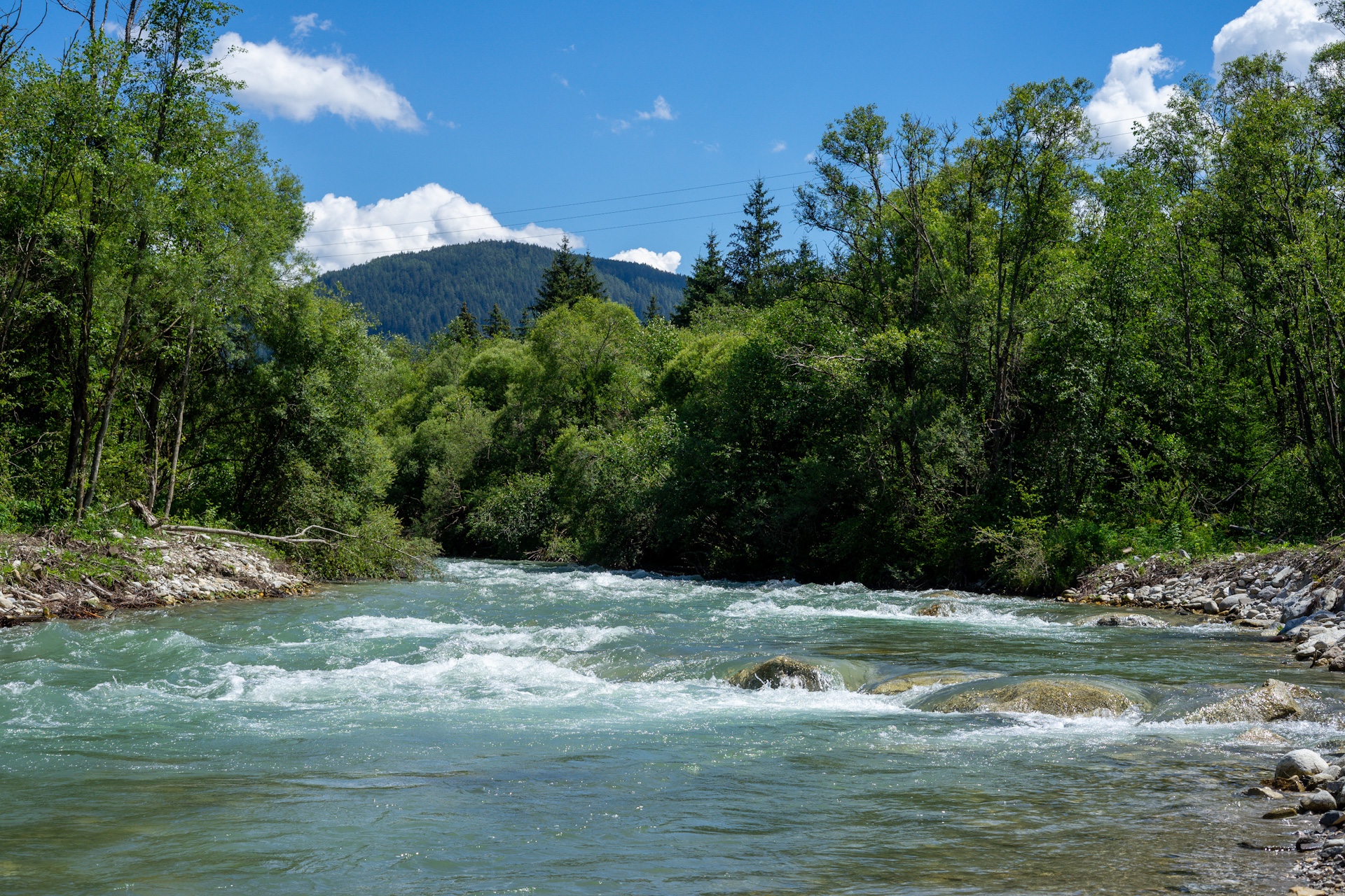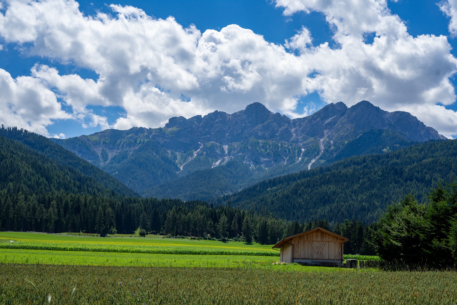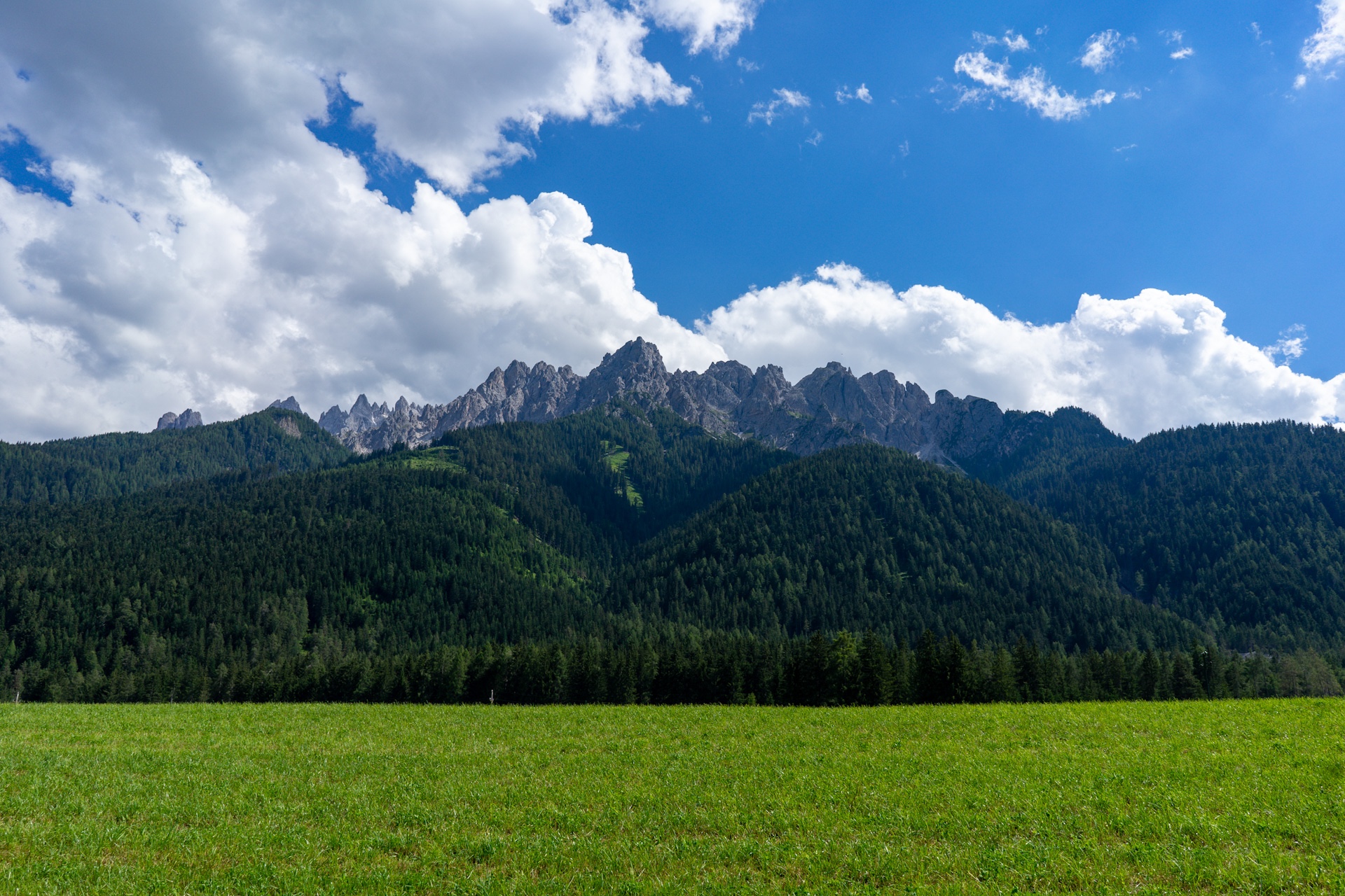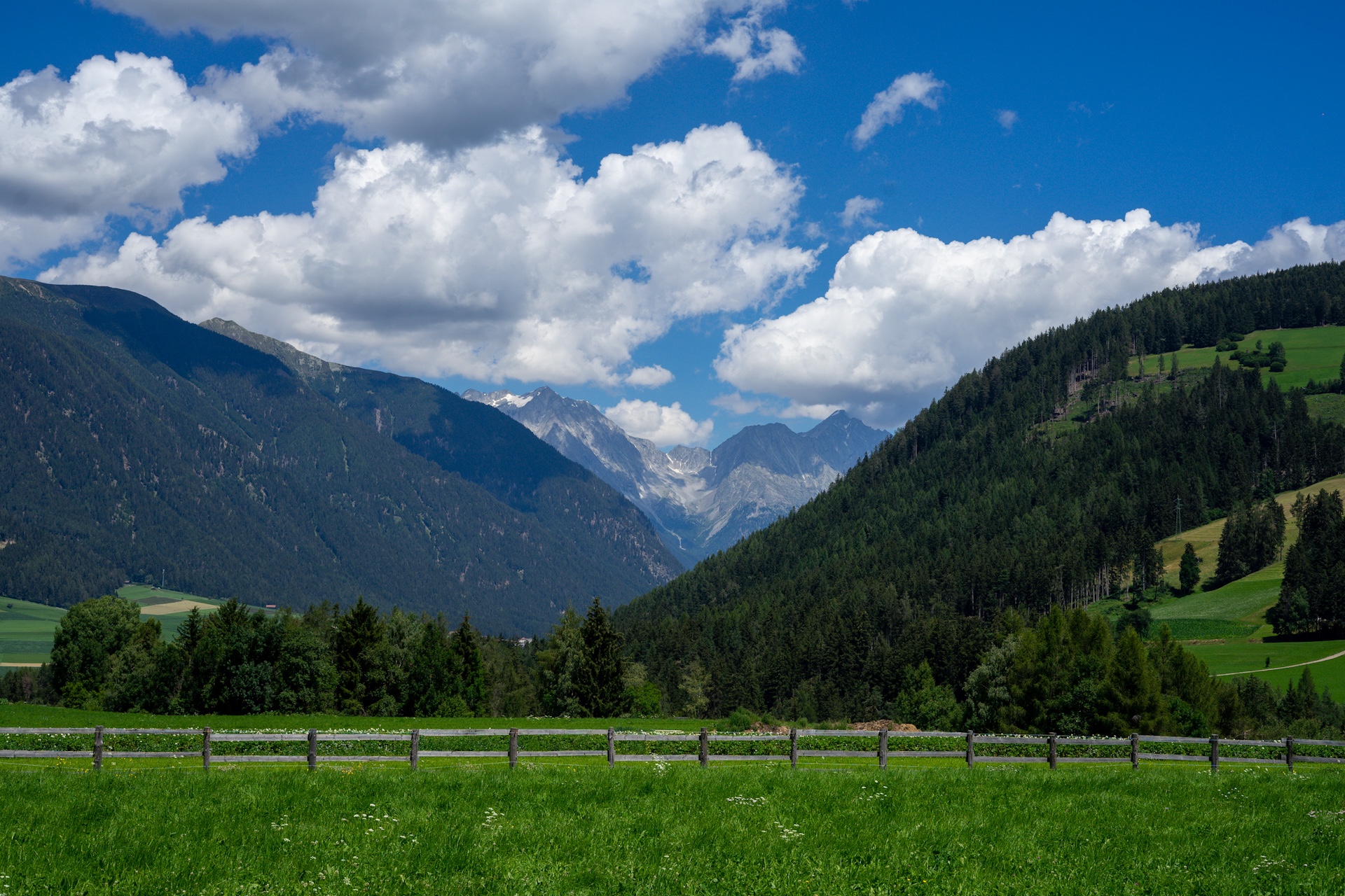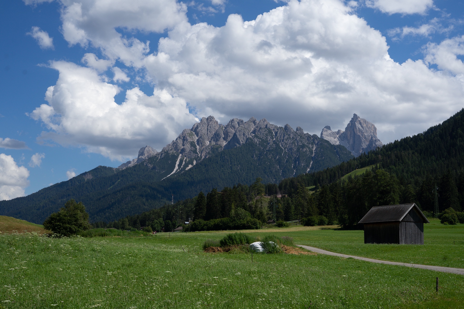 Heute haben wir entlang des Weges kaum erwähnenswerte Architektur entdeckt, stattdessen die wohl schönsten Landschaften der gesamten Tour, zumindest bisher. Wir fahren das Pustertal stetig bergauf. Auf der rechten Seite die schroffen Berge der Lienzer Dolomiten und auf der linken immer wieder kurze Blicke auf die sanft geschwungenen grünen Berge der hohen Tauern.