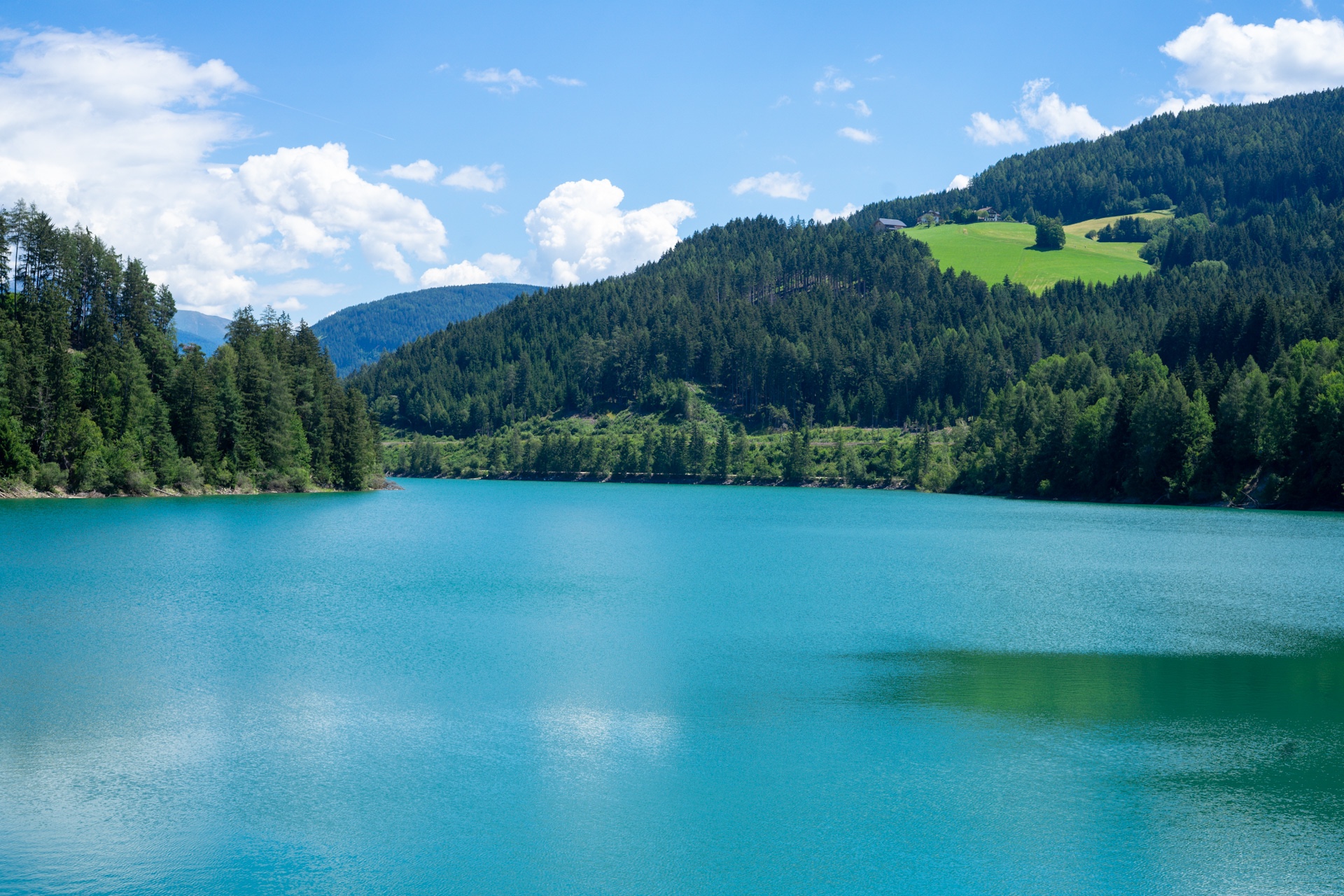 Die Wolken türmen sich zwar immer wieder an den Bergen rechts und links des Tals, es sind jedoch nur harmlose, strahlend weiße Quellwolken. Also beschließen wir die Vorhersage Vorhersage sein zu lassen und halten immer wieder an malerischen Orten an und lassen die Natur auf uns wirken. Vorbei an, durch den Kalk der Alpen, Türkis gefärbten Stauseen, reißenden Flüssen und durch lichte Wälder. Hier möchte man gerne verweilen. Doch in der Ferne, am Ende des Pustertals ragt diese Felsformation auf, die uns wie magisch anzieht.